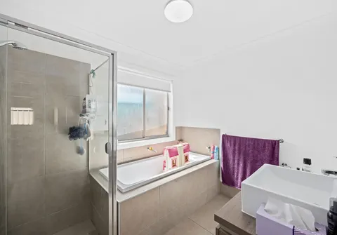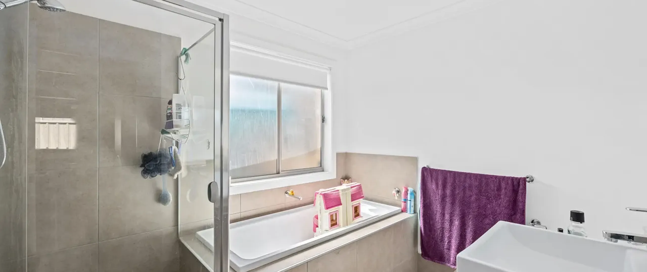 - Sleek neutral main bathroom with separate bath and shower + linen storage