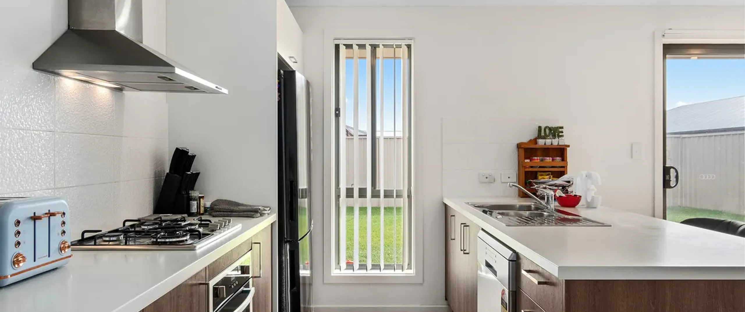 - Modern kitchen with stainless steel dishwasher, oven and gas cooktop, equipped with ample cupboard and bench space, complete with breakfast bar
