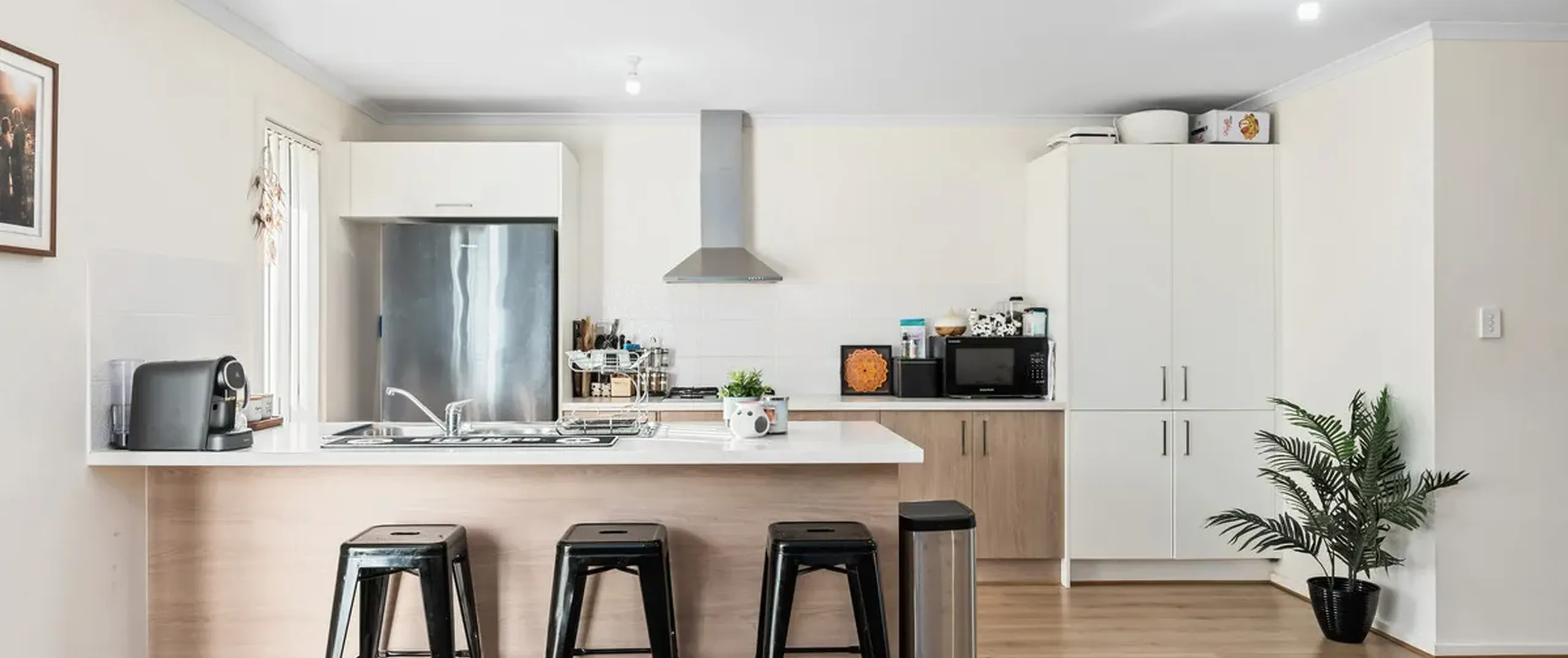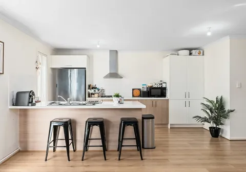 - Modern kitchen with stainless steel dishwasher, oven and gas cooktop, equipped with ample cupboard and bench space, complete with breakfast bar