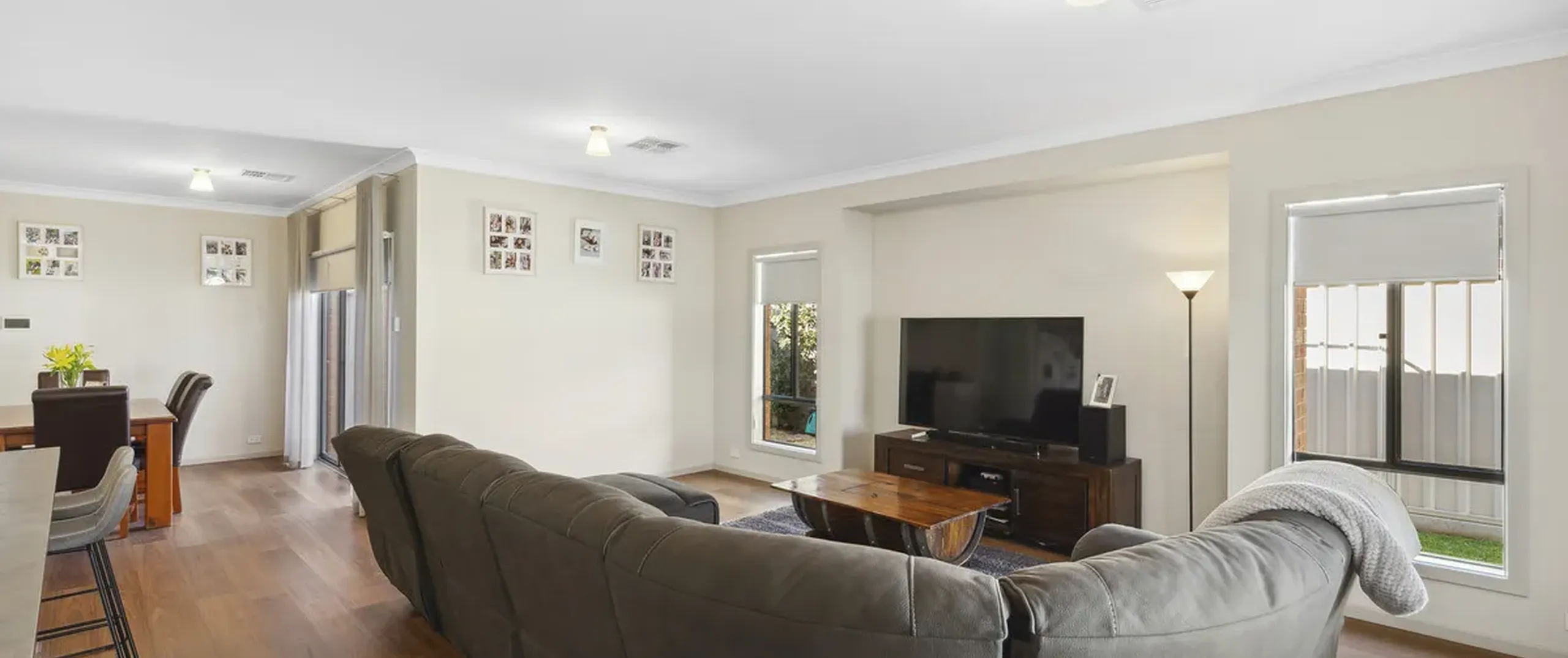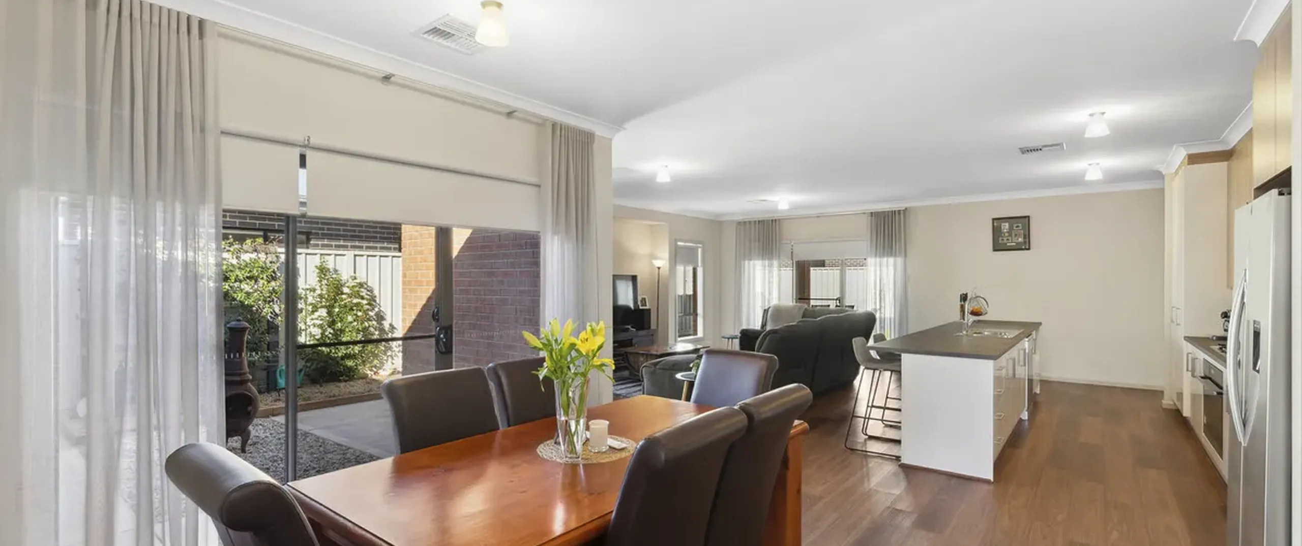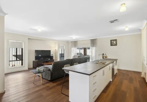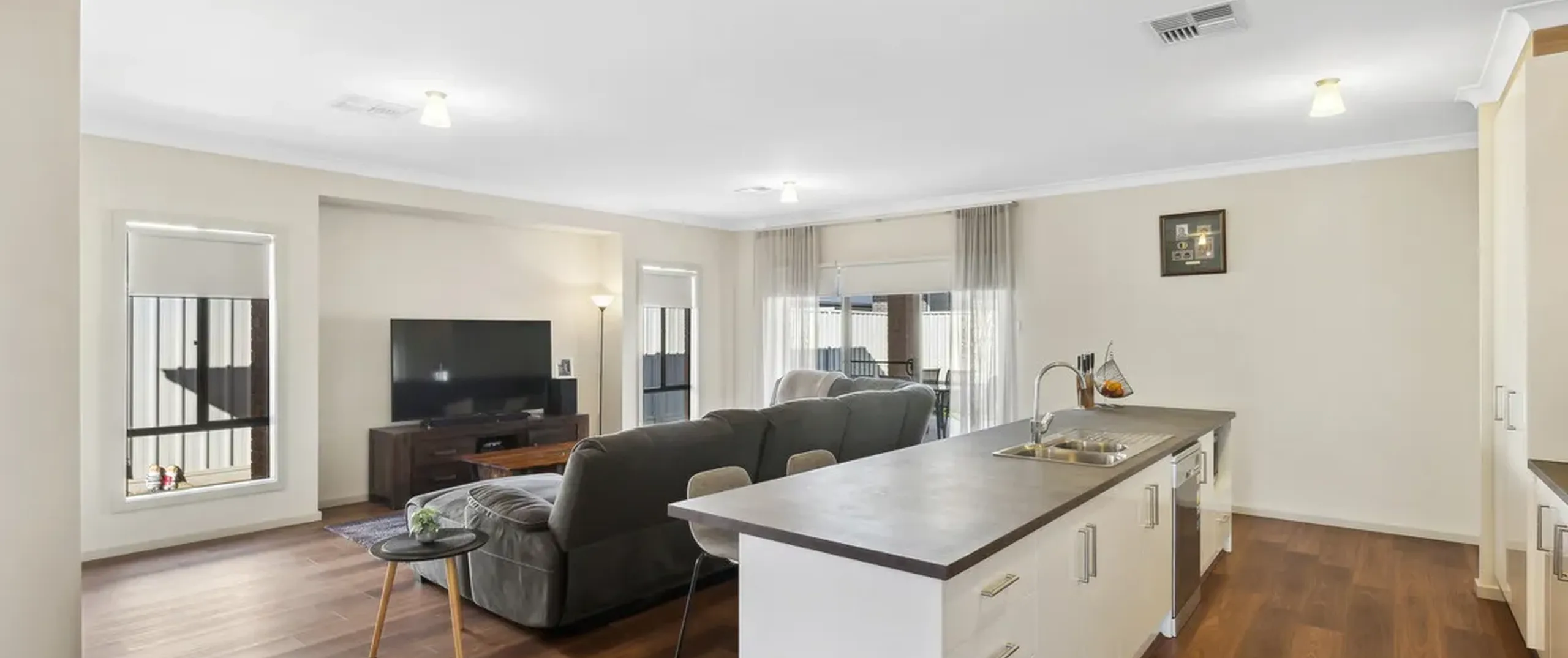 - Light filled living, kitchen and meals area with on-trend flooring underfoot