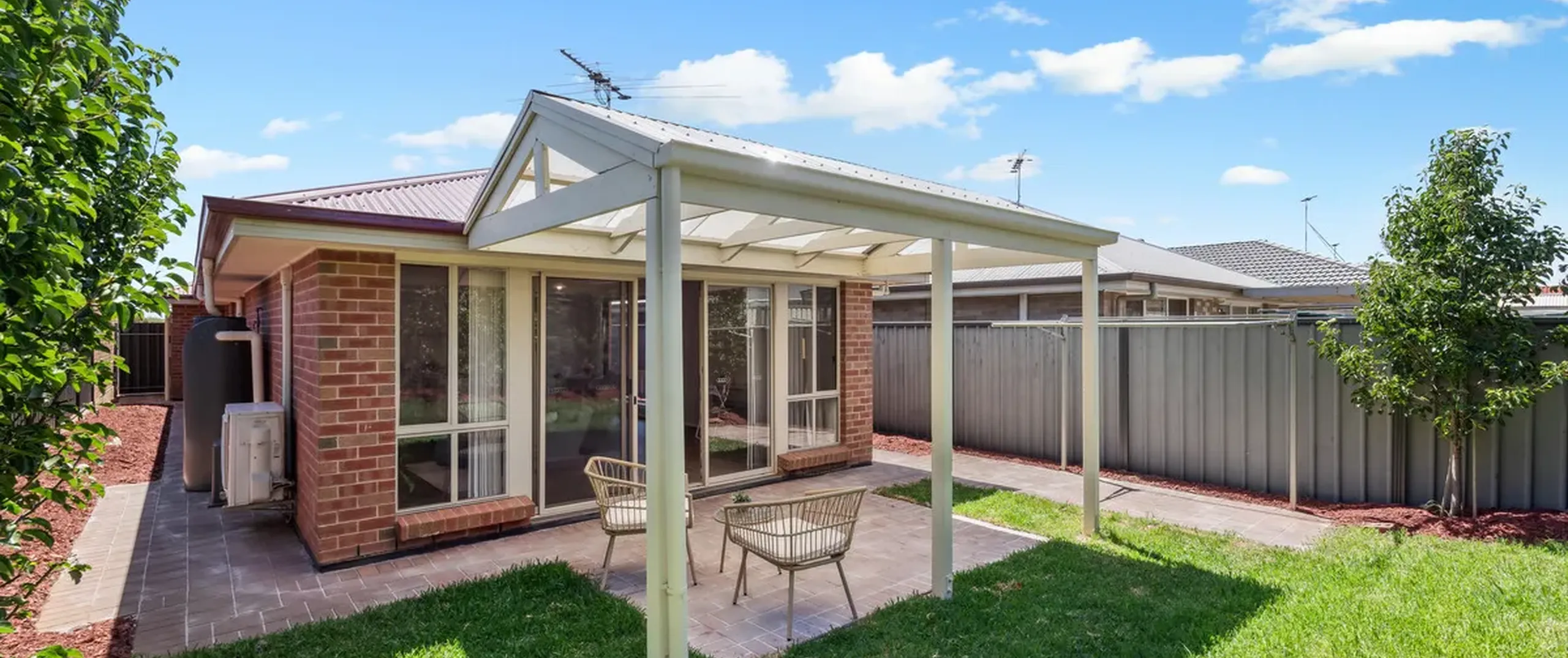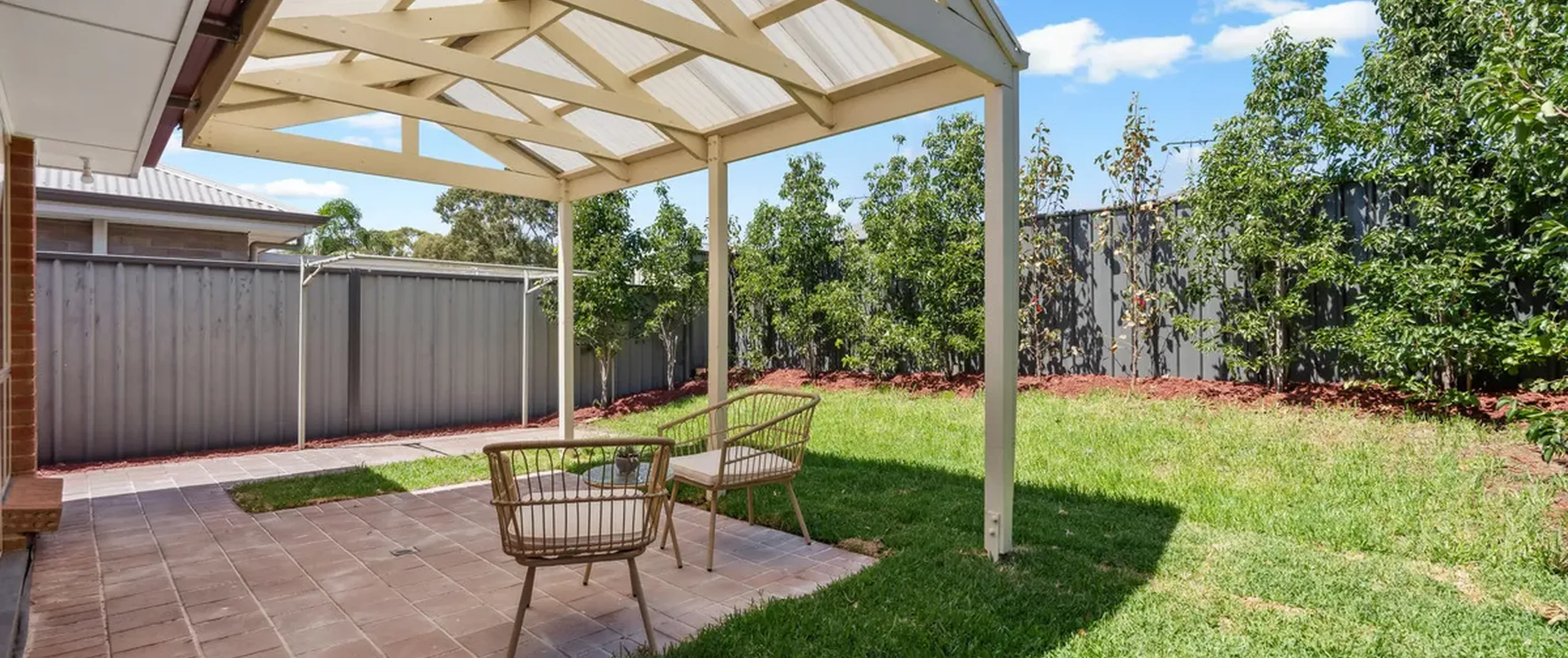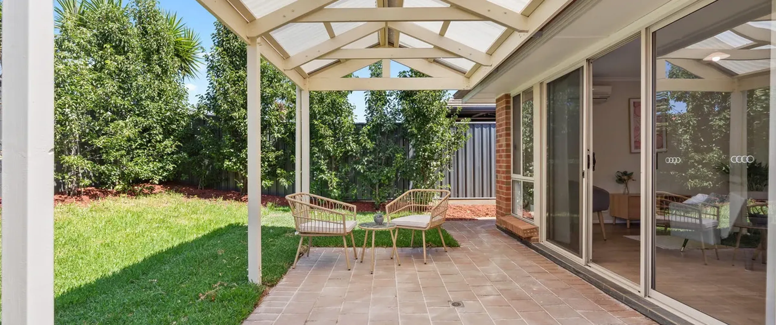 - Outdoor entertaining space with pitched roof pergola