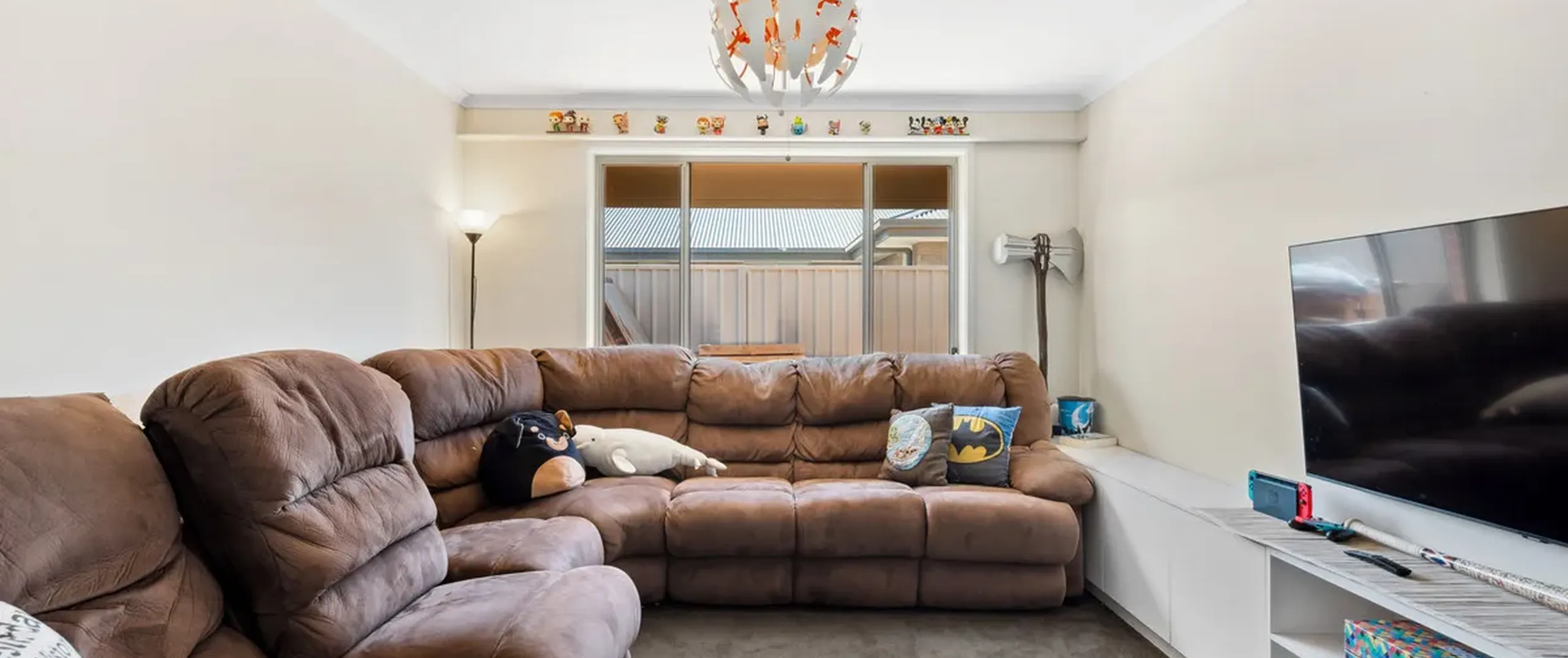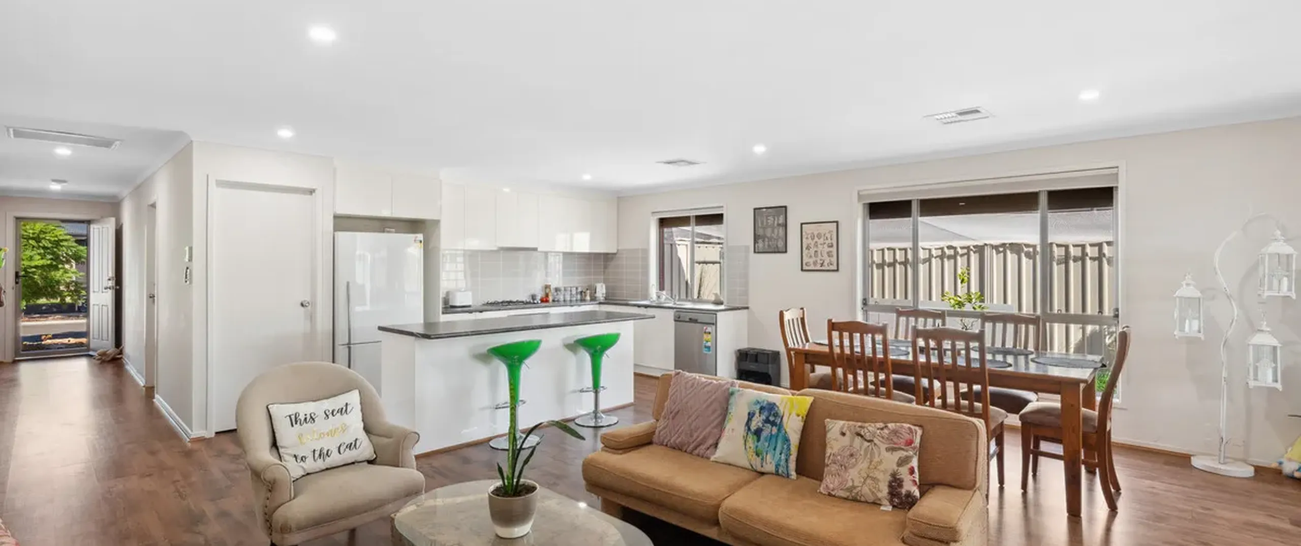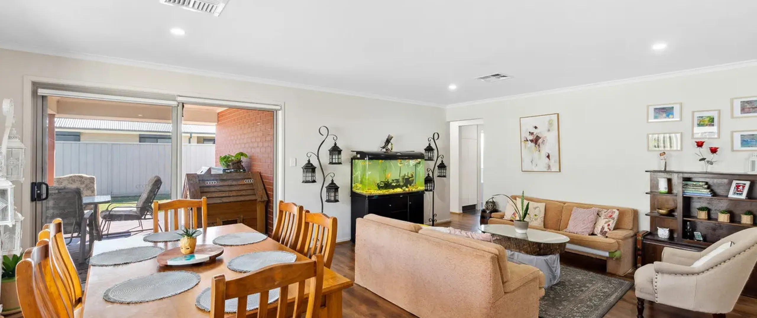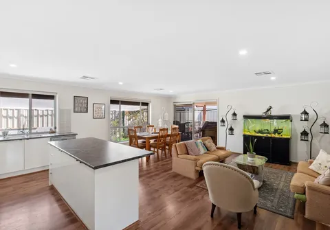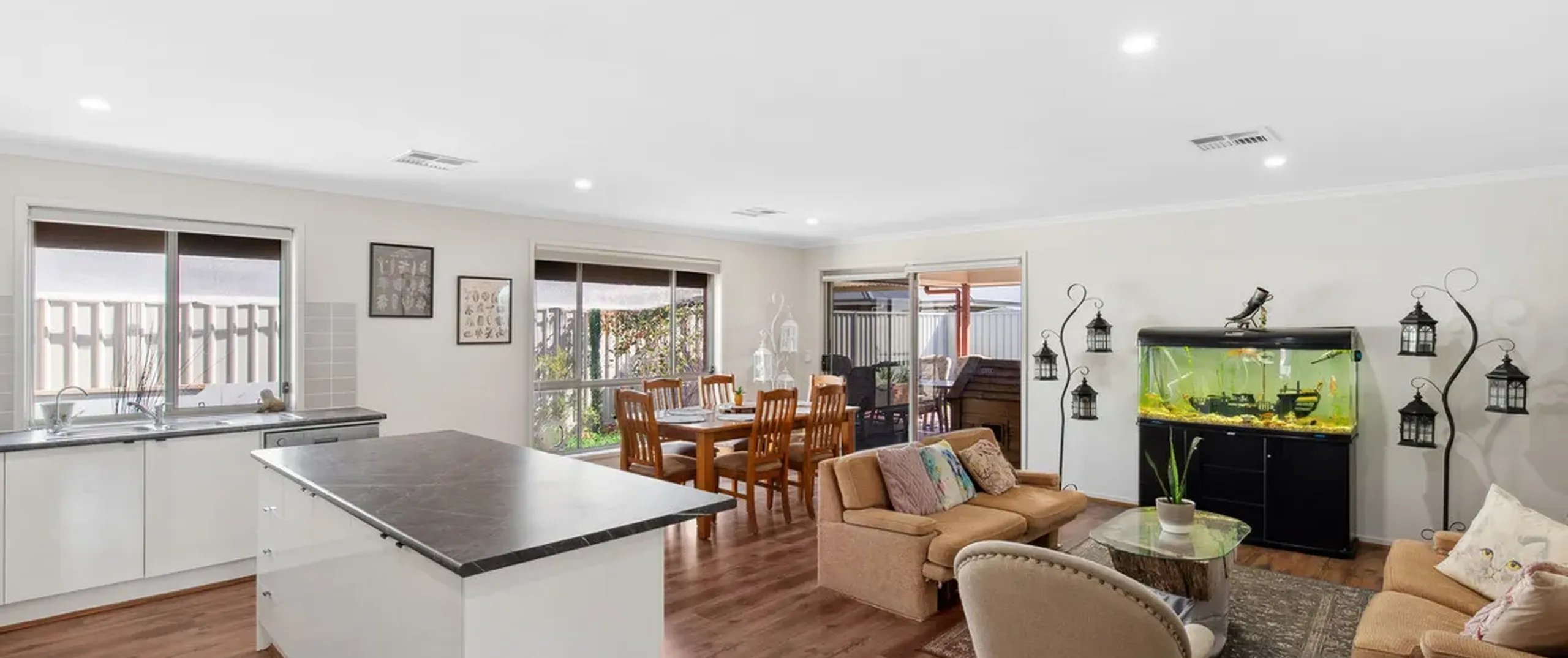 - Open plan family room seamlessly connects to the backyard through sliding doors
