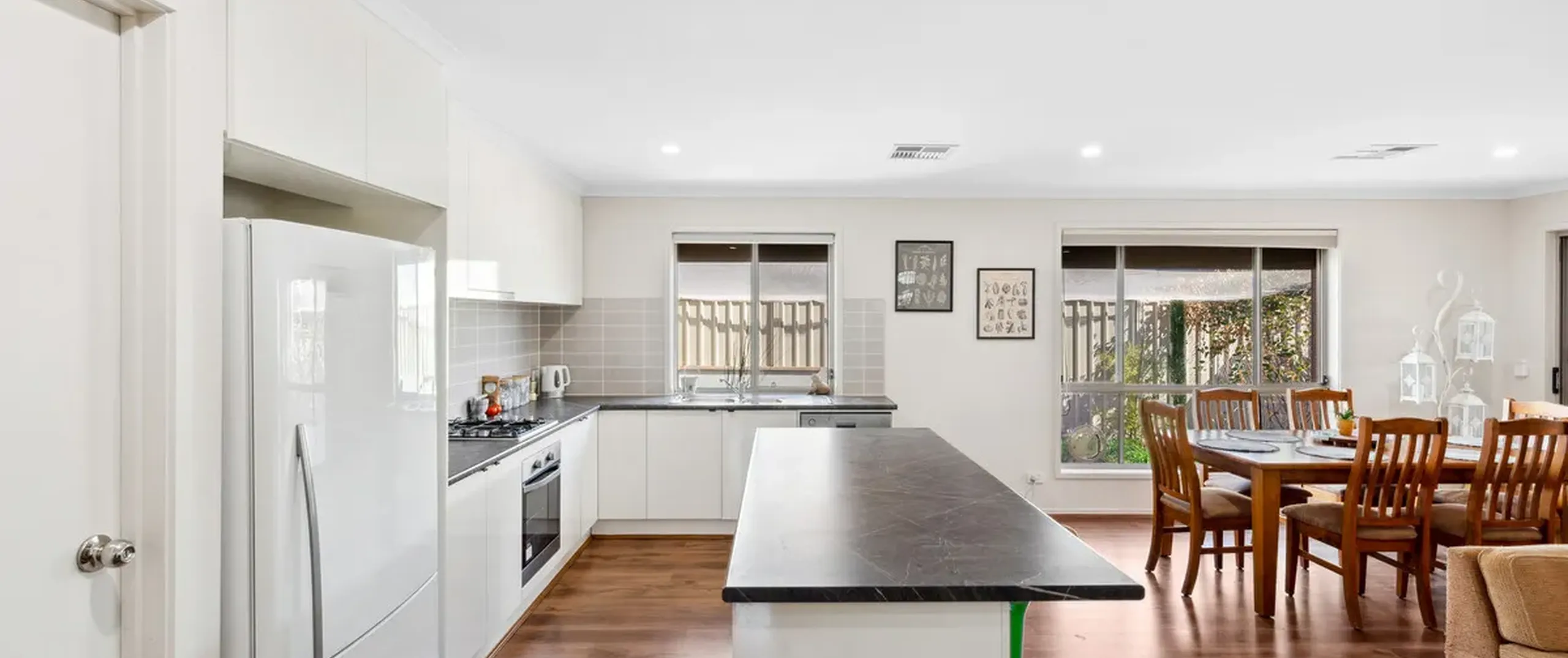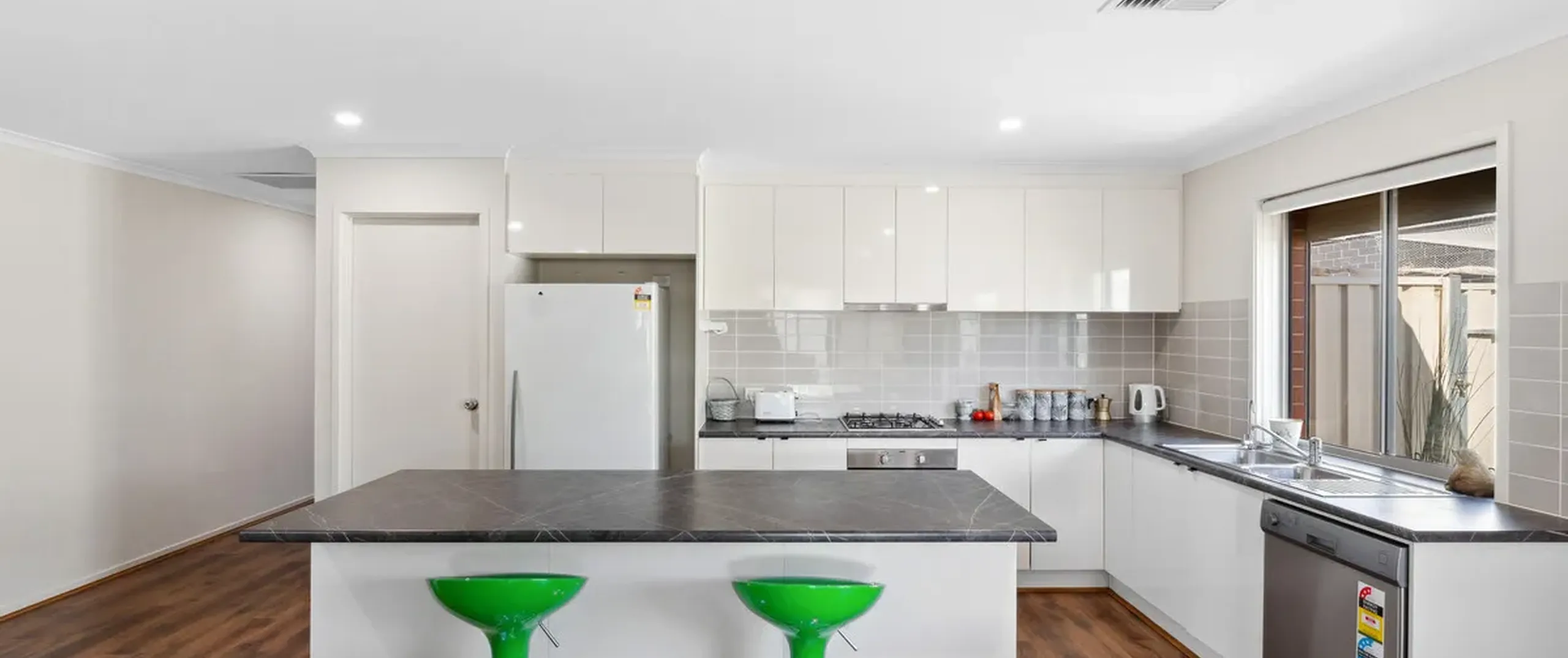 - Modern and spacious kitchen boasts stainless steel appliances, including an oven and gas cooktop, complemented by ample cupboard and bench space and a generous breakfast bar
