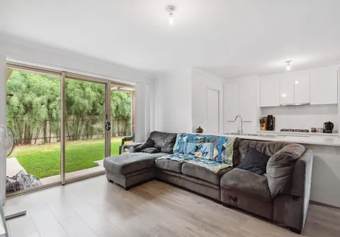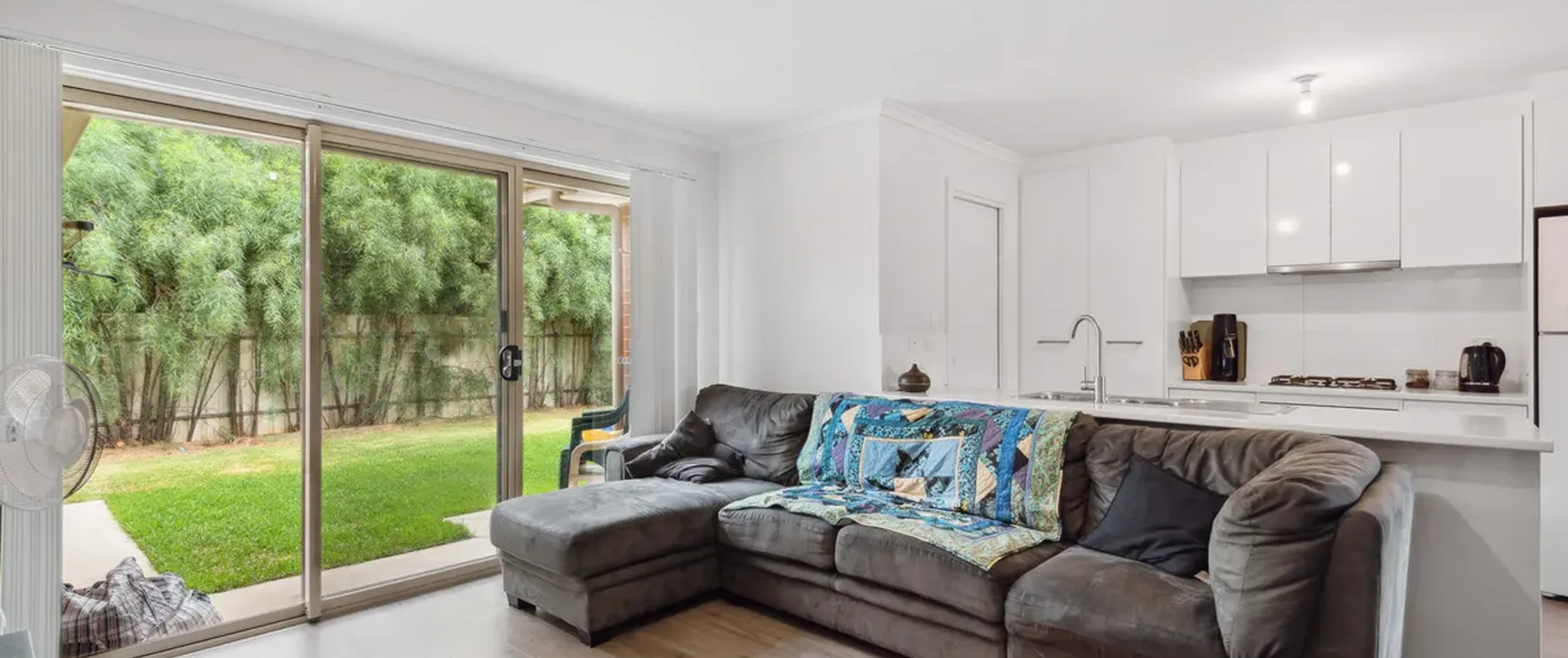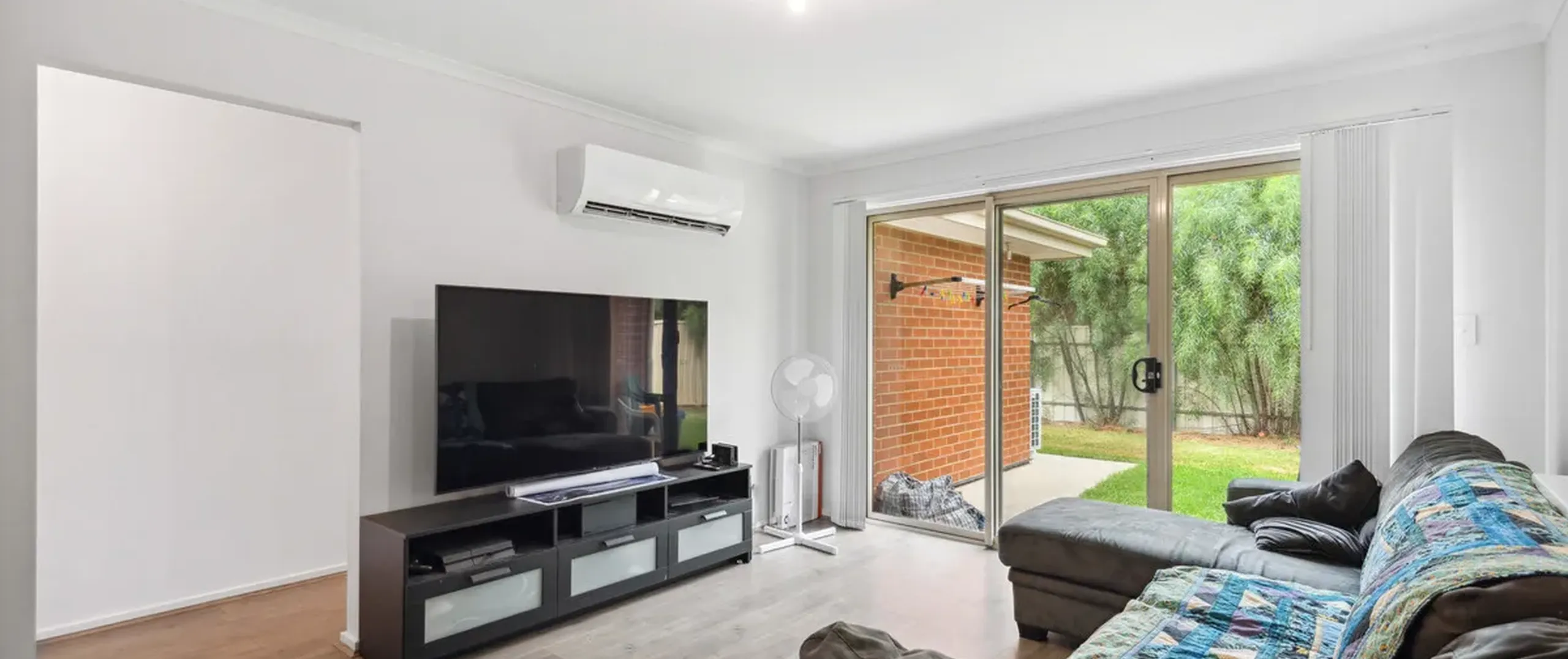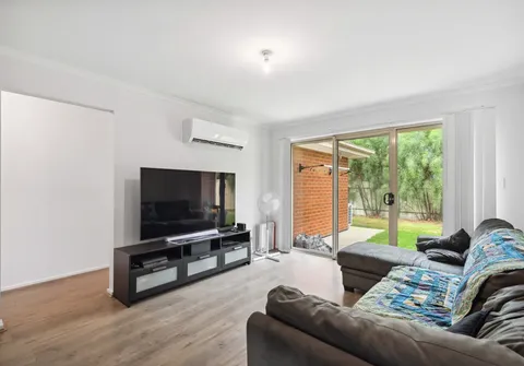 - Light-filled open-plan living and kitchen area with split system air conditioner and sliding door to the backyard