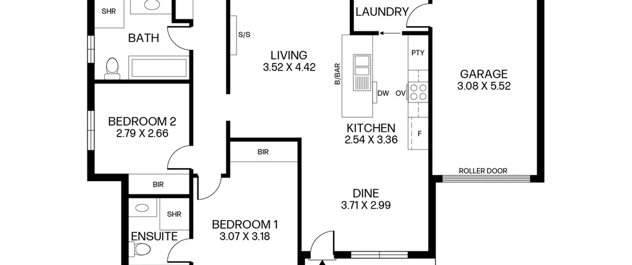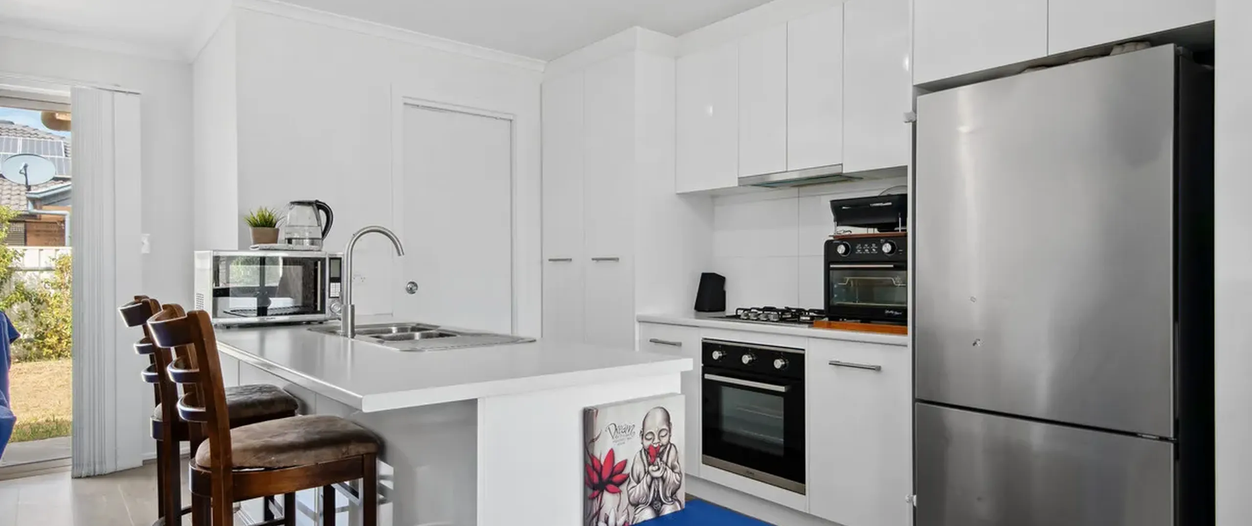 - Sparkling white kitchen with gas cooking, dishwasher, breakfast bar and ample cupboard and bench space