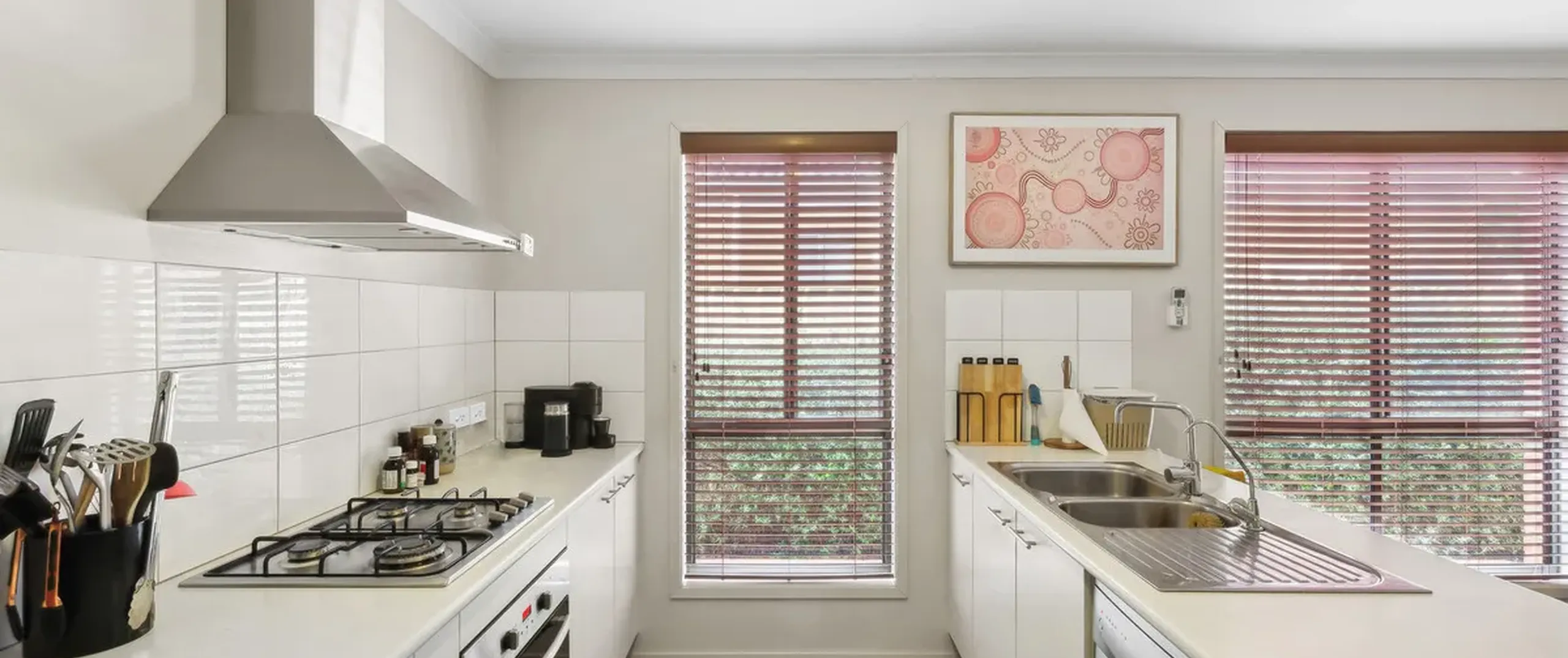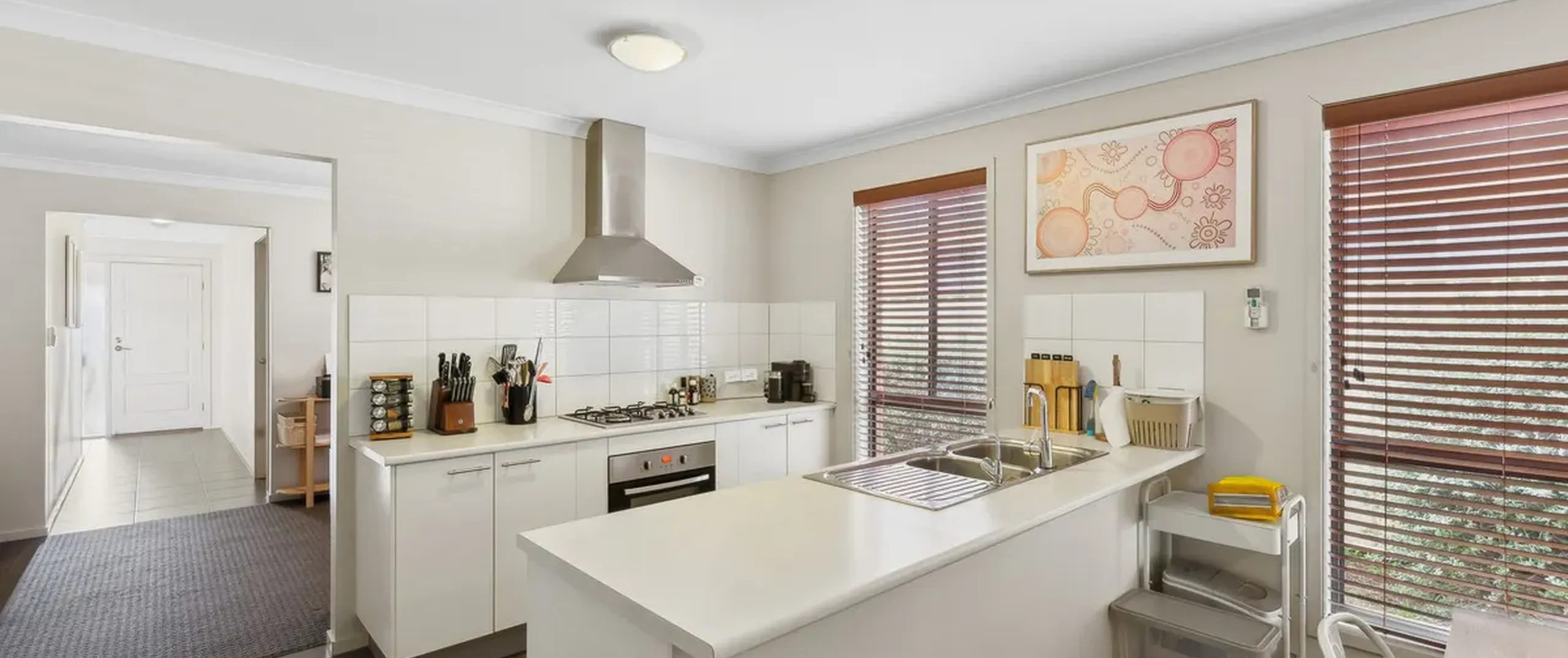 - Modern kitchen with breakfast bar, stainless steel gas cooktop, oven and dishwasher and walk-in pantry