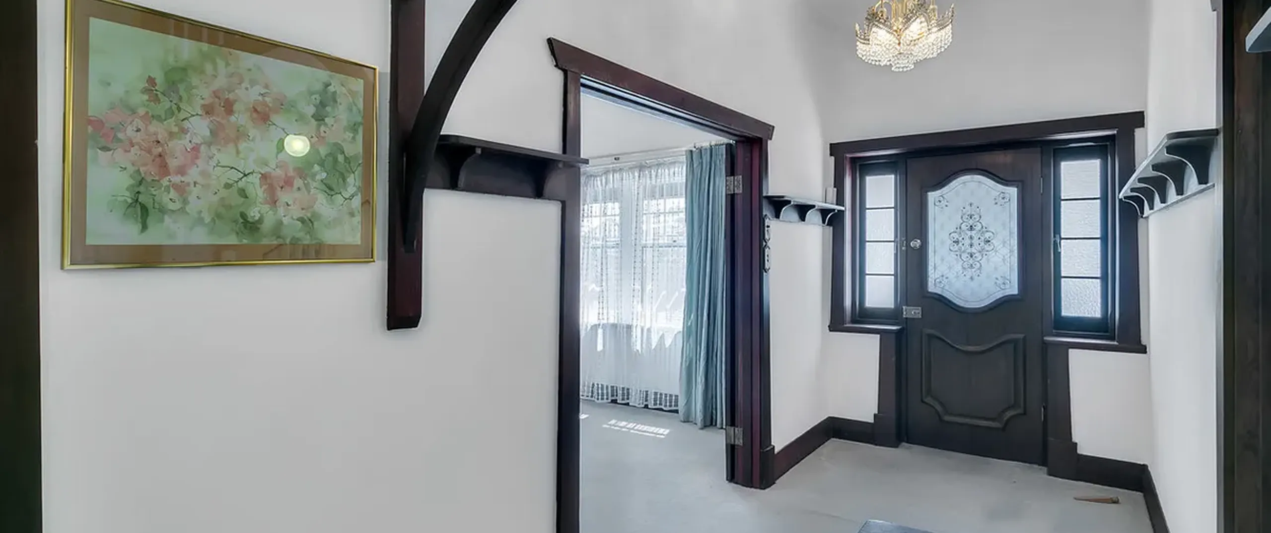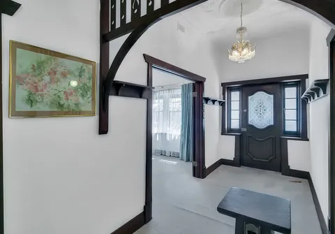 - Wide entrance with feature ceiling dome, gold chandelier and timber fretwork