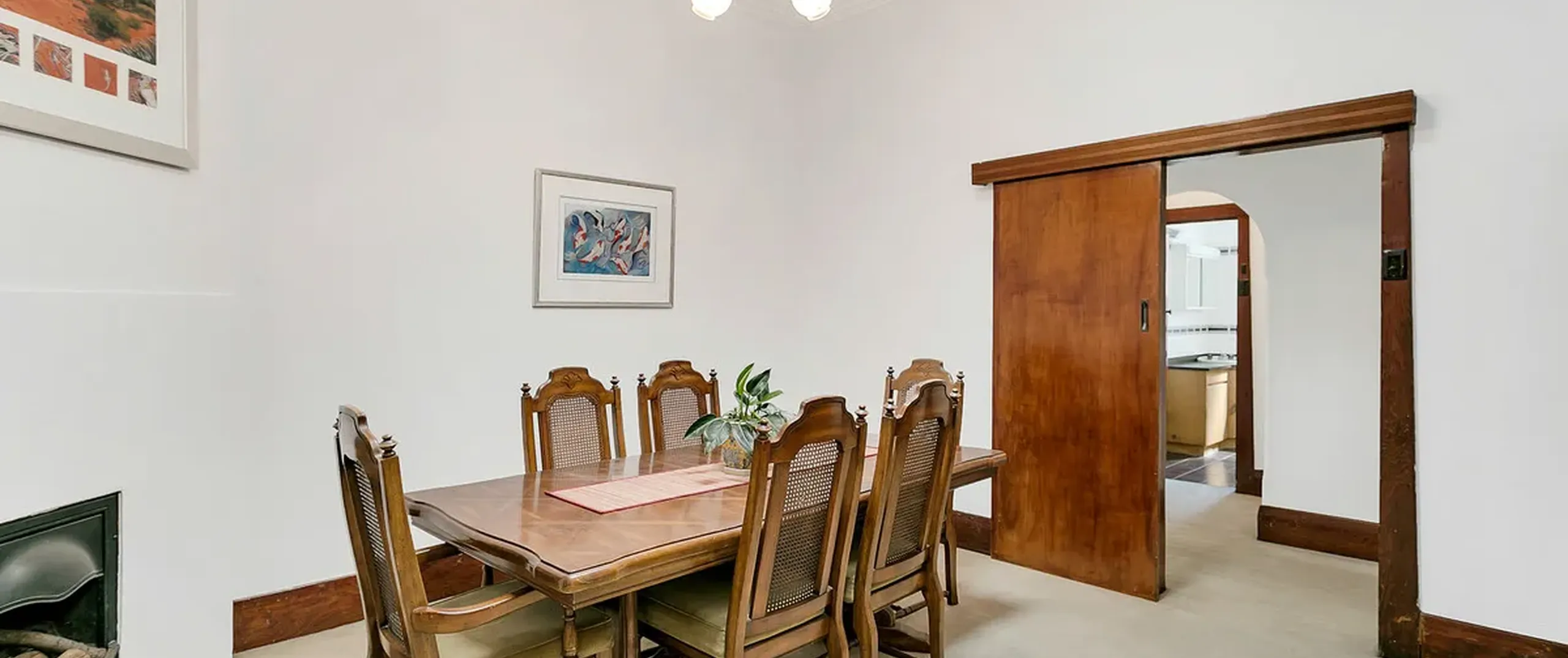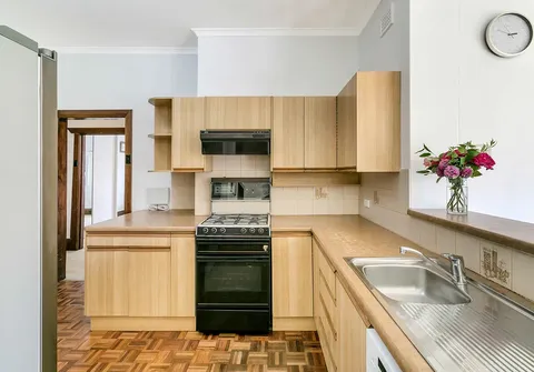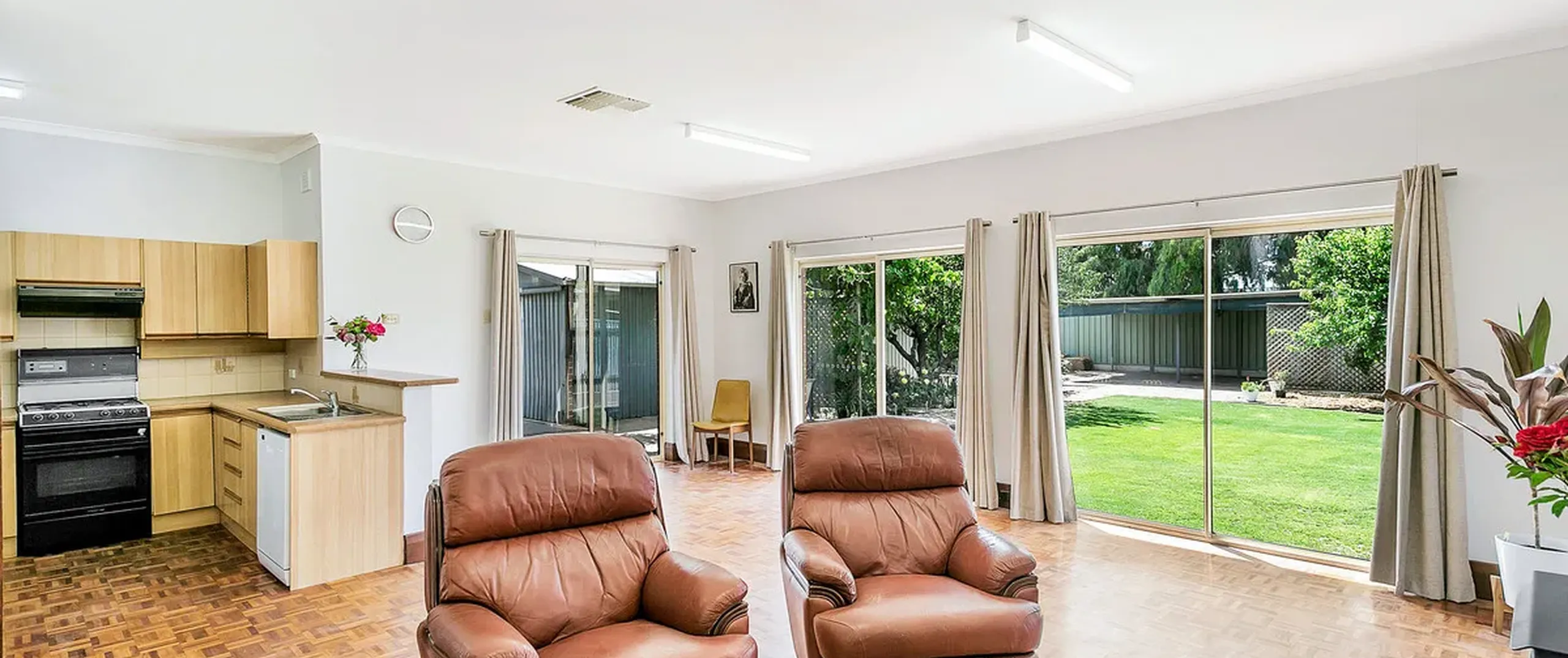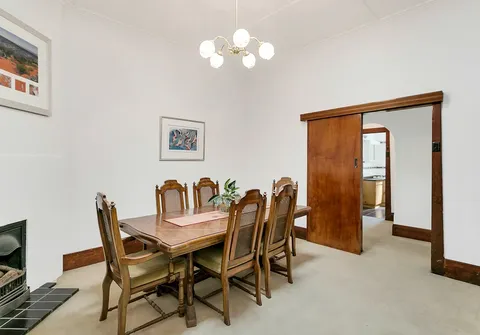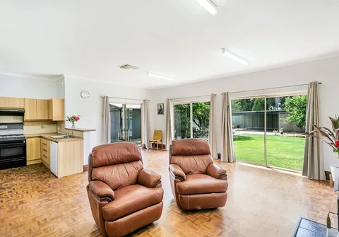 - Open plan living/kitchen area with parquetry flooring, slow combustion heater and lots of natural light coming through the dual sliding doors that lead to the large North Facing rear yard