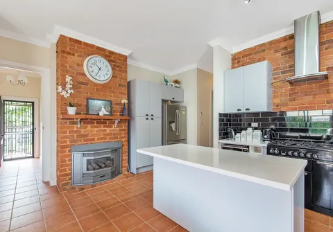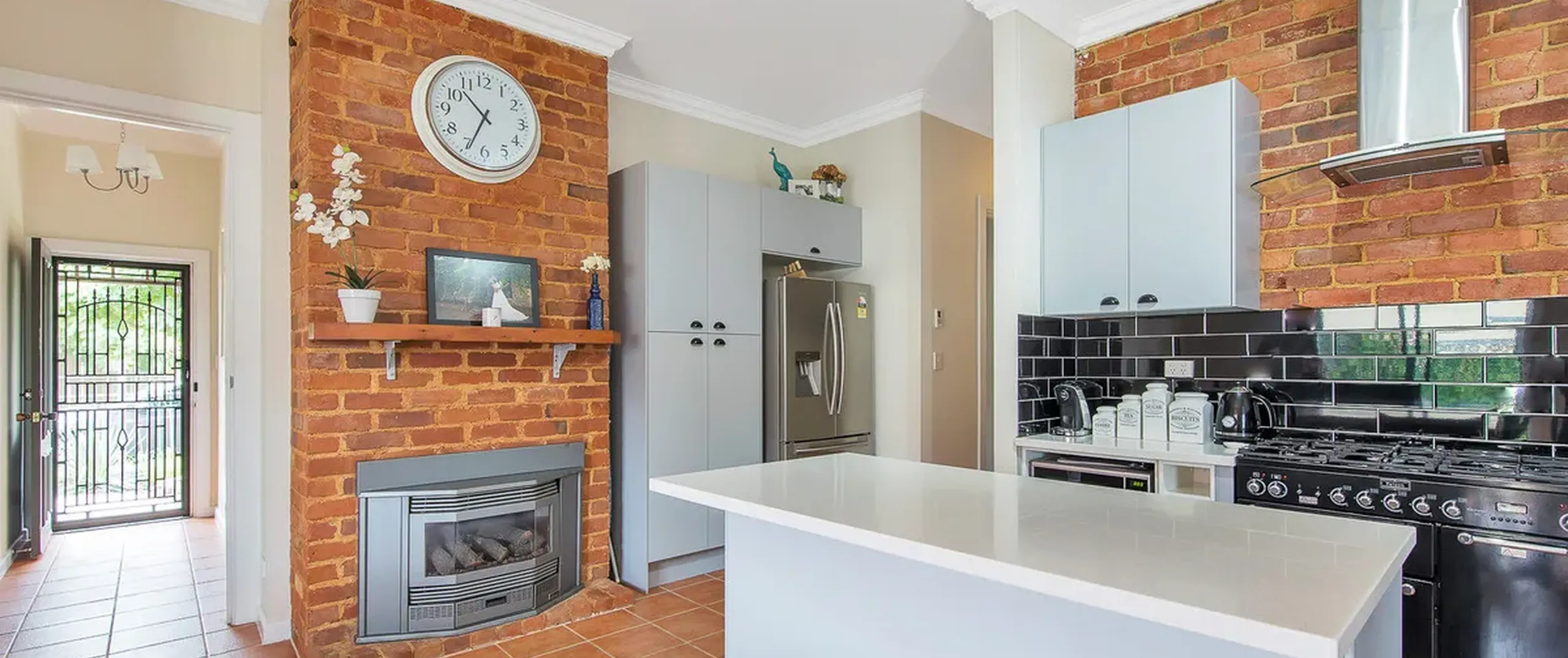 - Kitchen with gas cooking, stainless steel dishwasher, breakfast bar and exposed brick feature walls