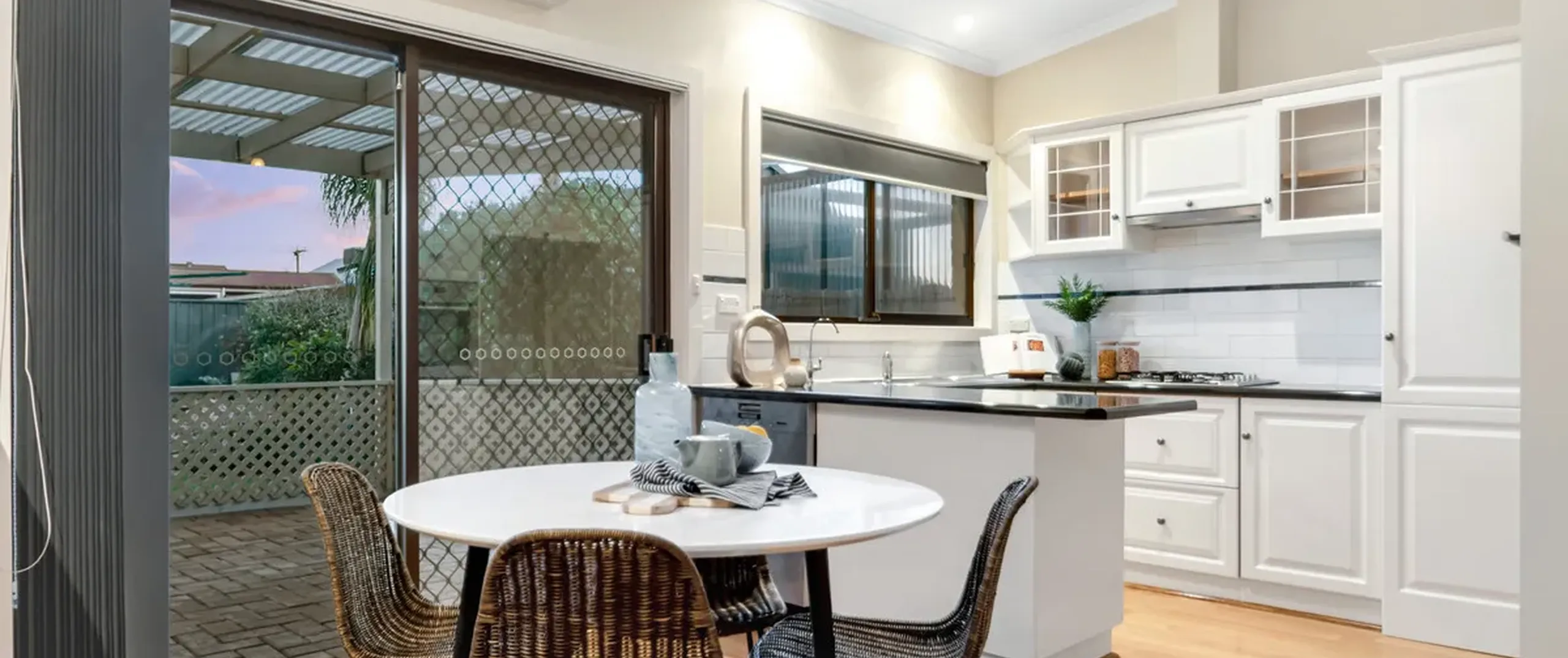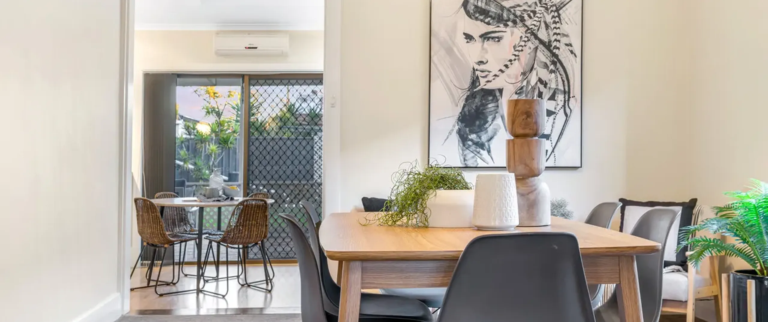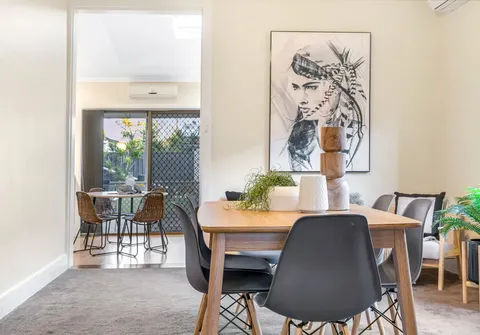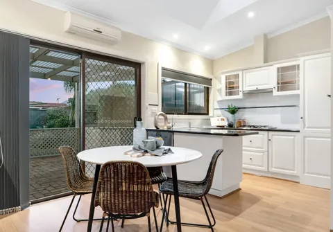 - Meals area adjacent to kitchen with split system air conditioner and heater