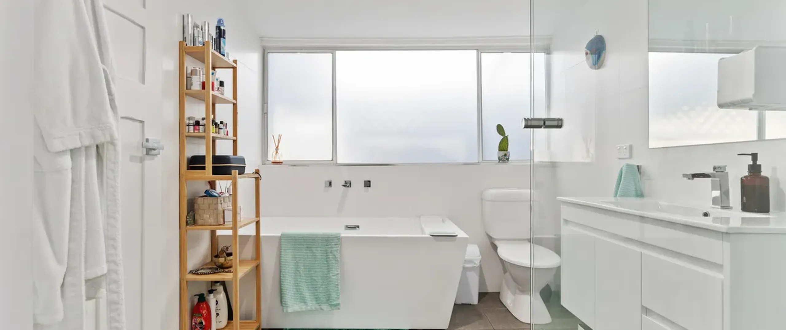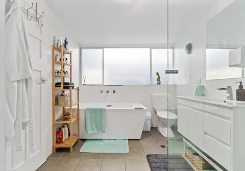 - Modern main bathroom complete with floor to ceiling tiles, bath and separate shower