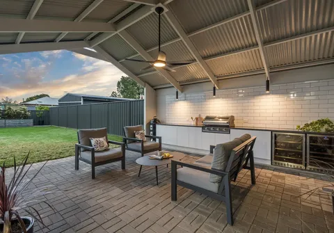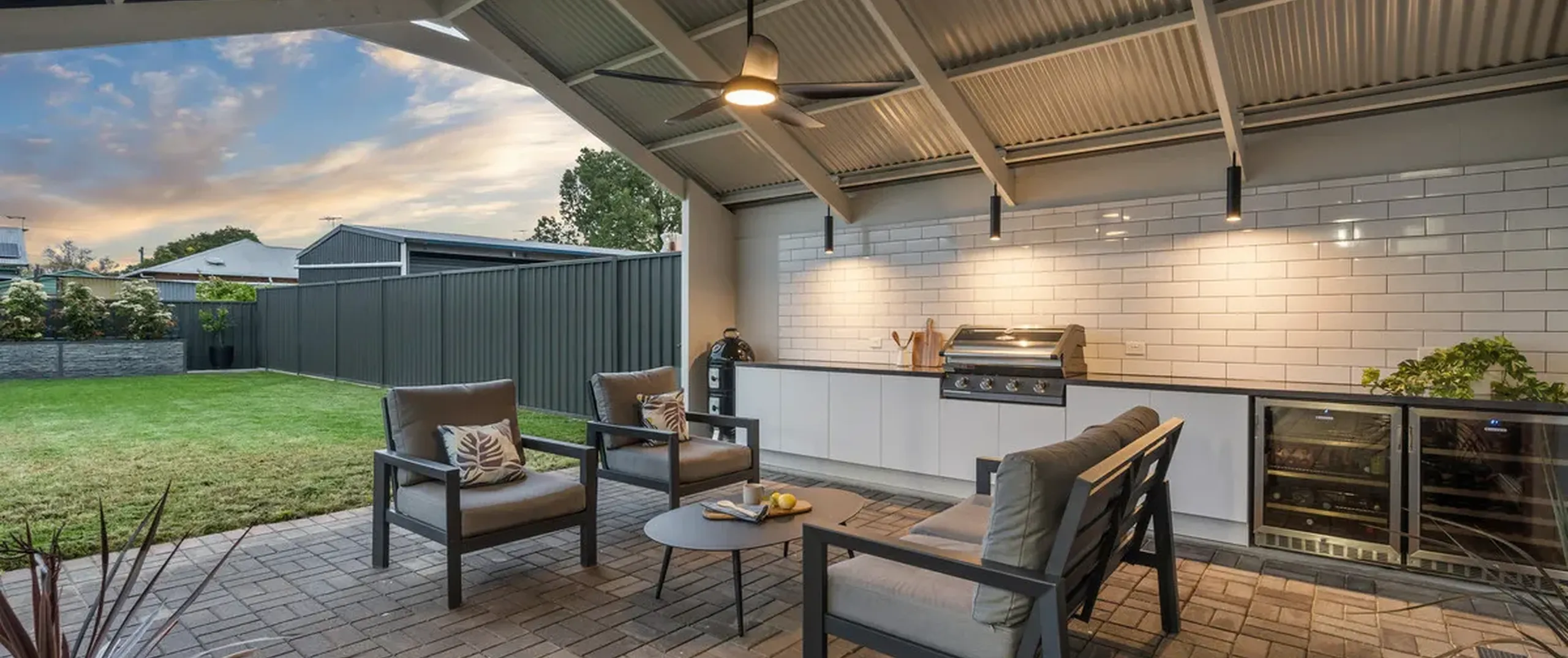 - Expansive undercover outdoor area with ceiling fan, built-in BBQ, double bar fridge and sweeping bench top with cupboard storage, making entertaining guests an absolute dream