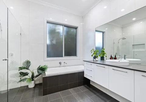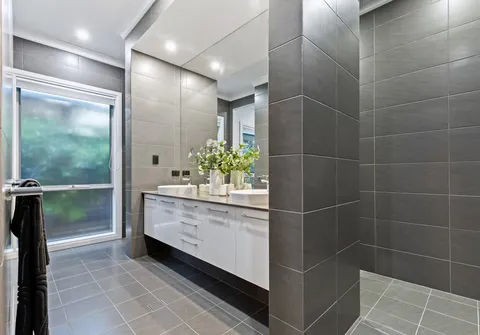 - Opulent master bedroom suite with generous walk-in robe, ceiling fan and lush ensuite featuring floor-to-ceiling tiles and double sink vanity