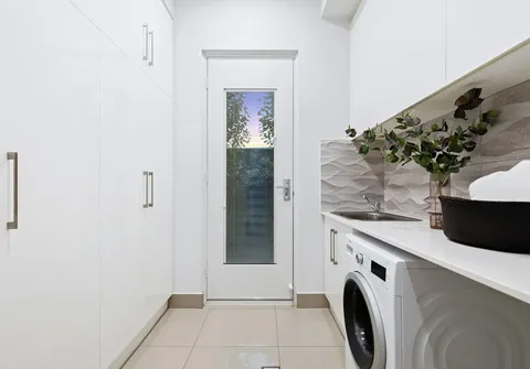 - Well-appointed laundry with ample built-in joinery, stone benchtops and external access
