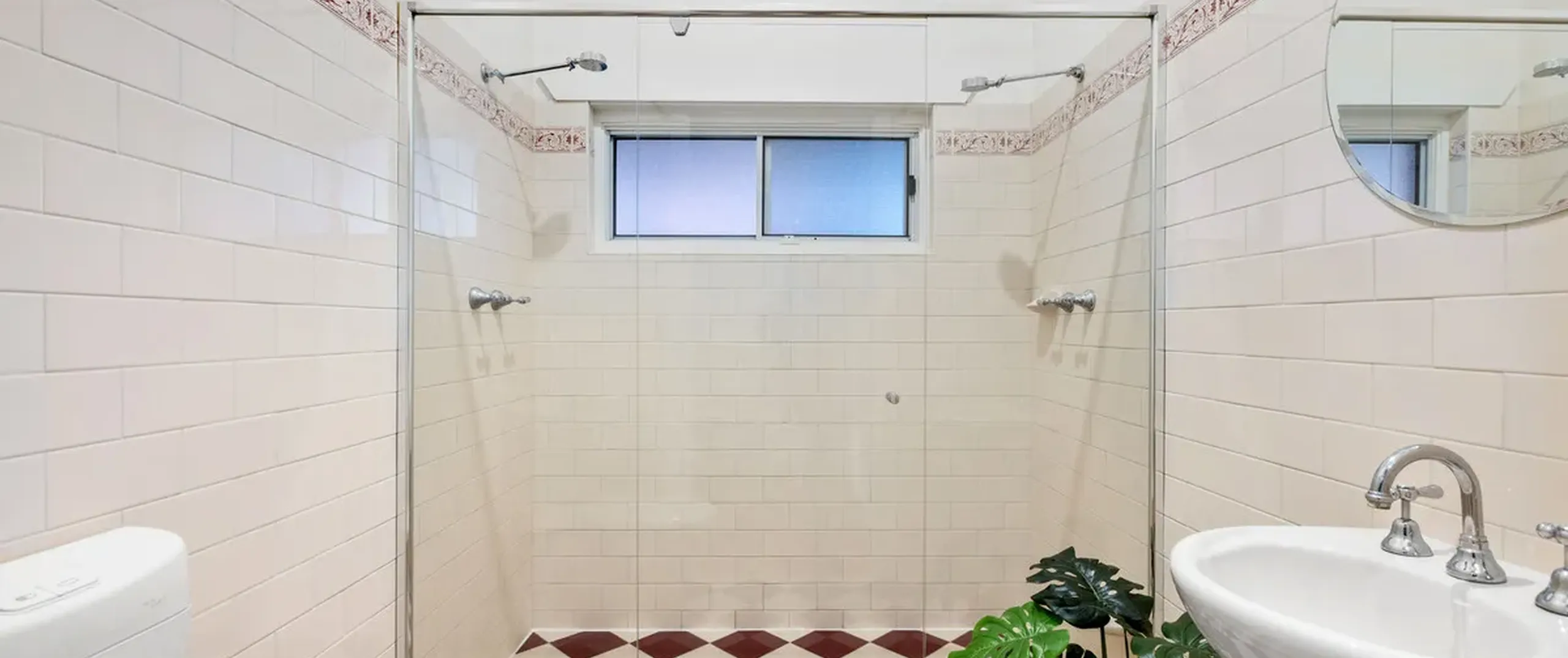 The modern kitchen is a cook’s dream with gorgeous cabinets, plenty of bench space, stunning stained glass window and stainless steel appliances including a 900mm oven plus a dishwasher.