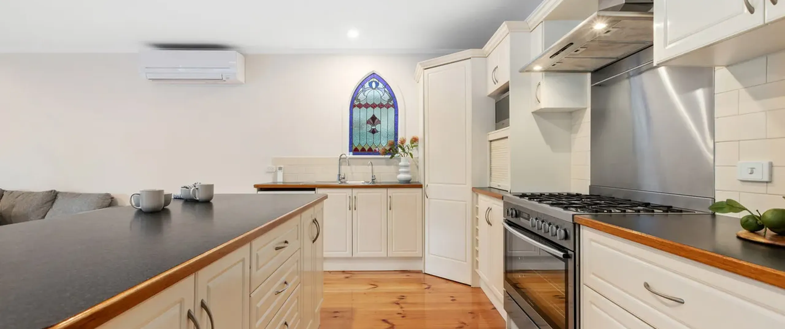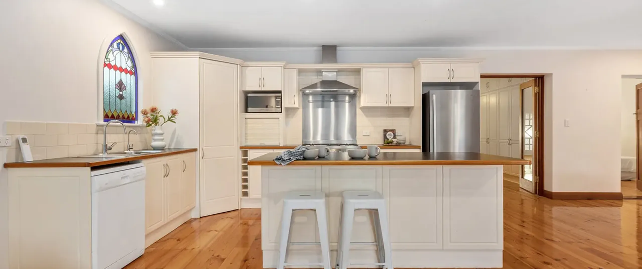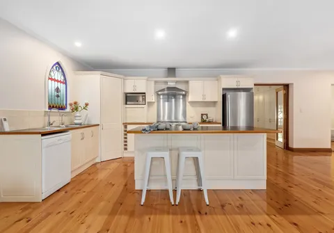 - Charming kitchen with large pantry, ample cupboard space, island bench with breakfast bar and stainless steel appliances including dishwasher and 900mm gas oven