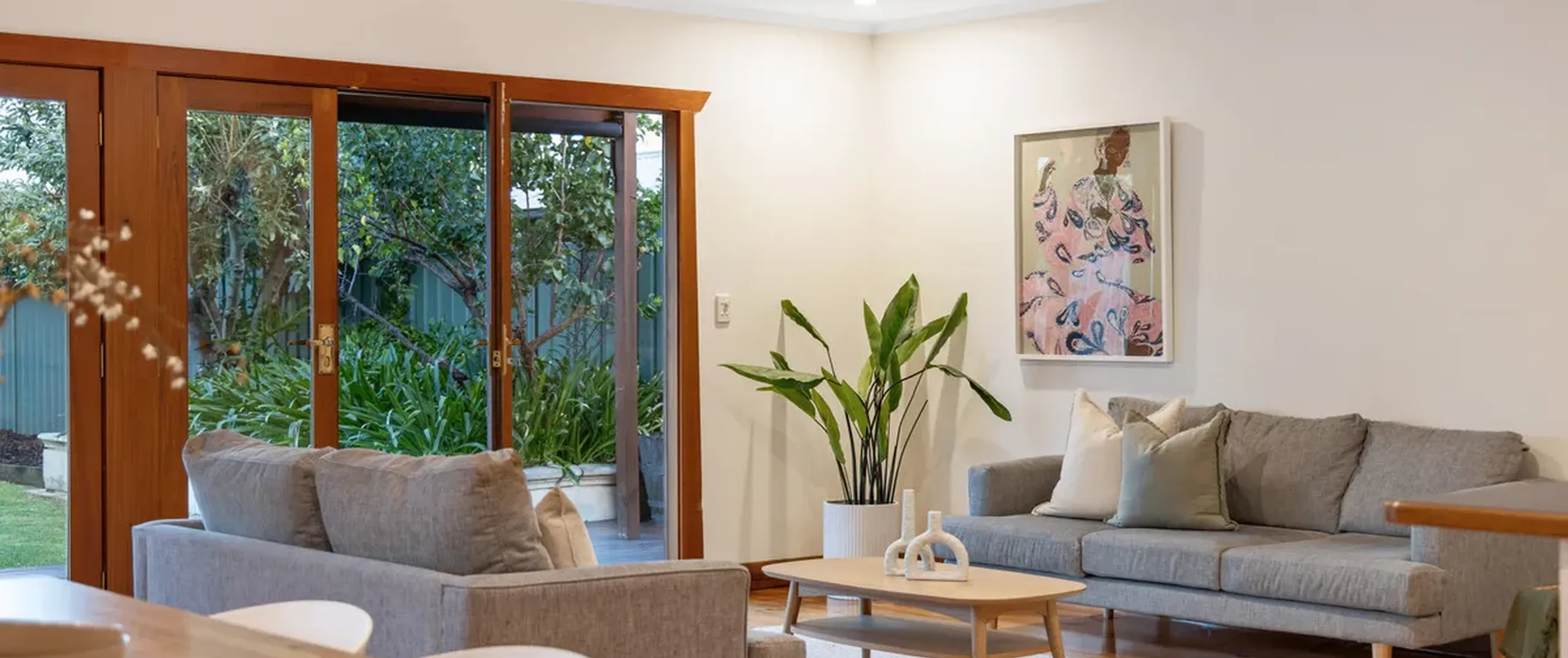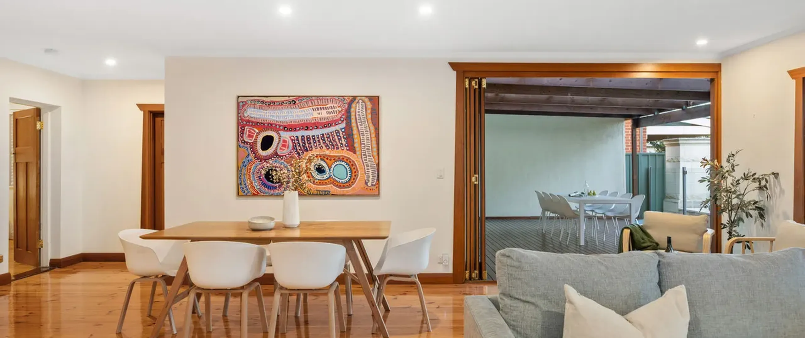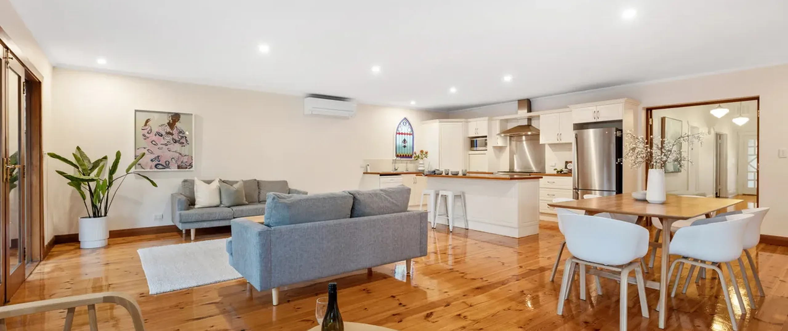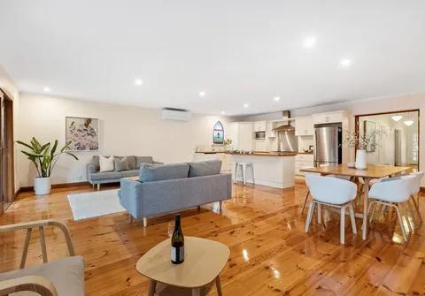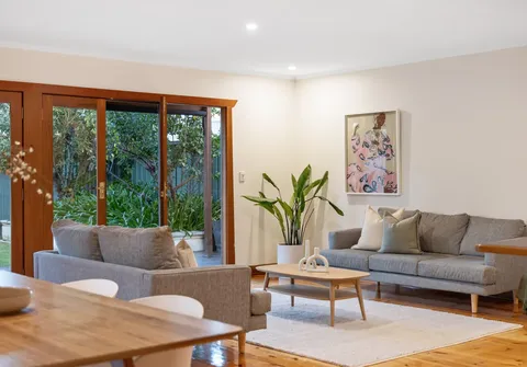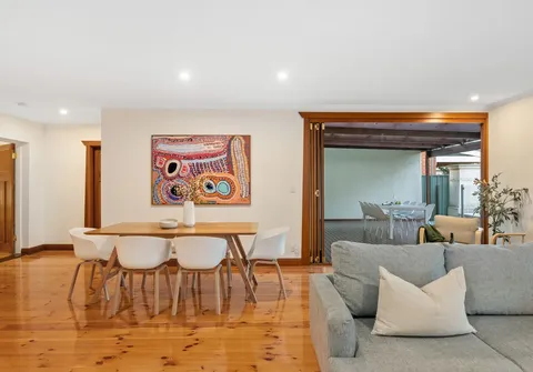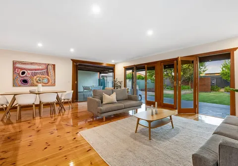 - Light filled open plan living and dining with split system air conditioner and both French doors and bi-fold doors opening to the outdoor entertaining area