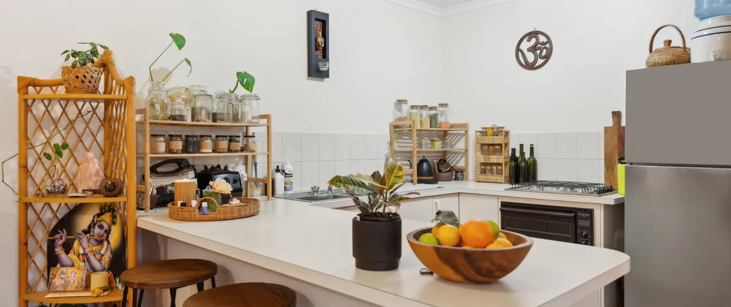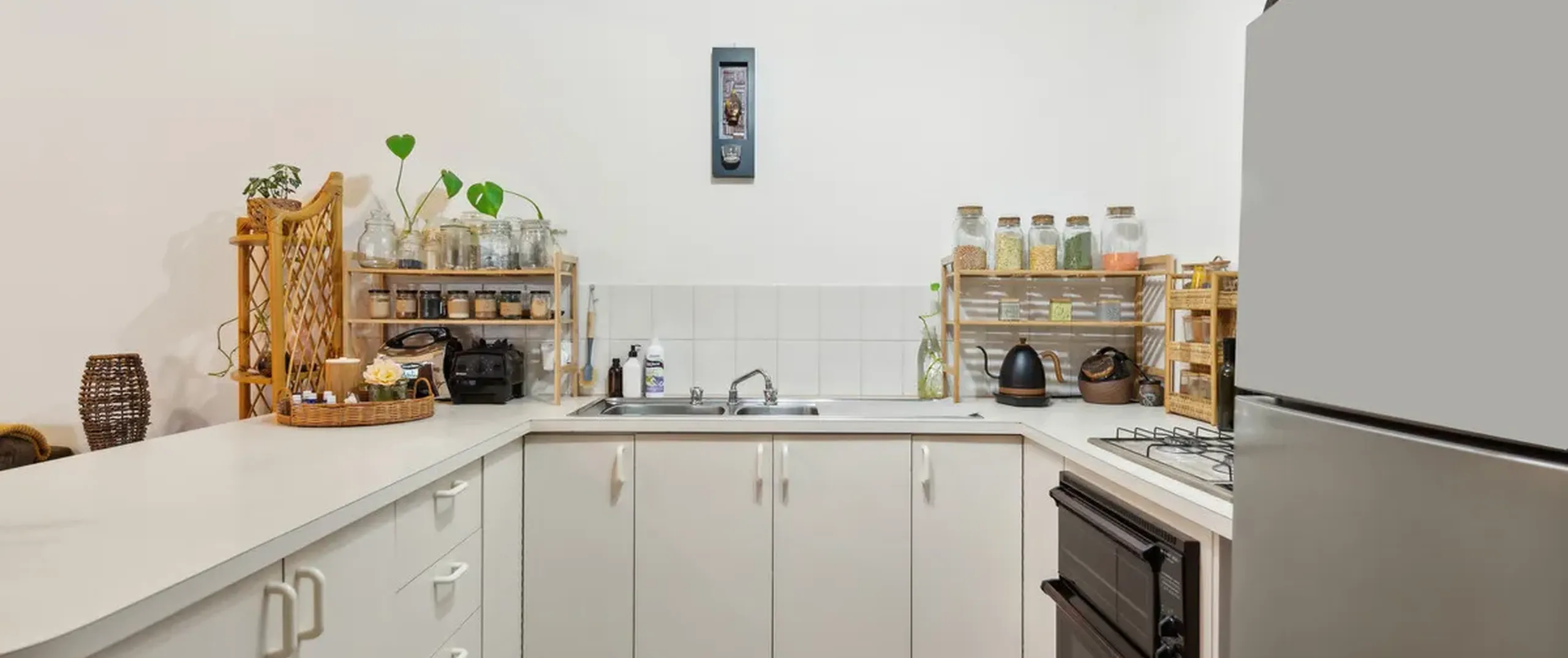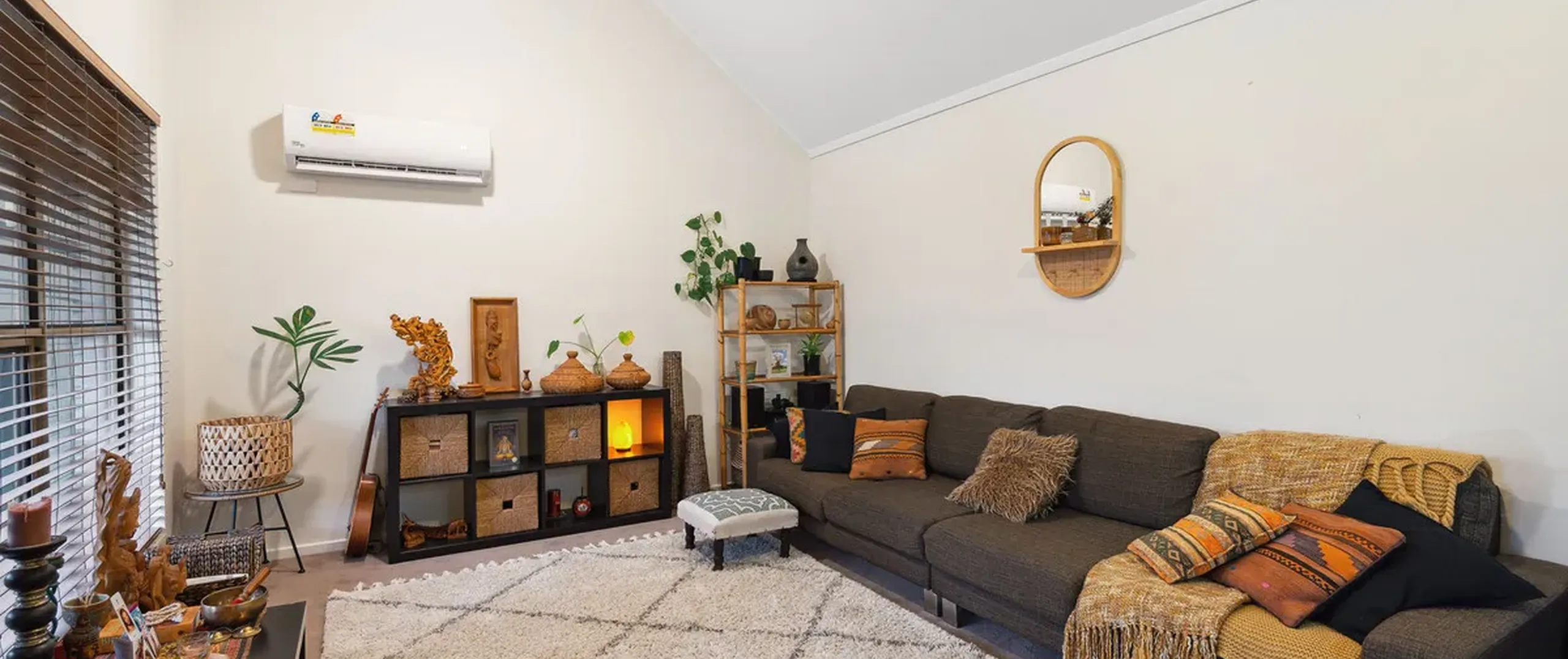 - Open plan kitchen with electric cooking generous cupboards and bench space open to living room and split system A/C