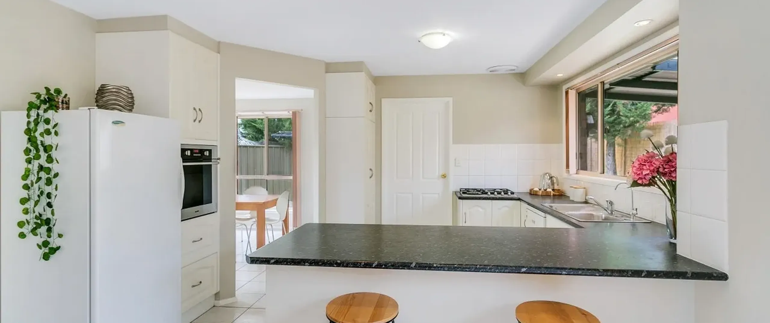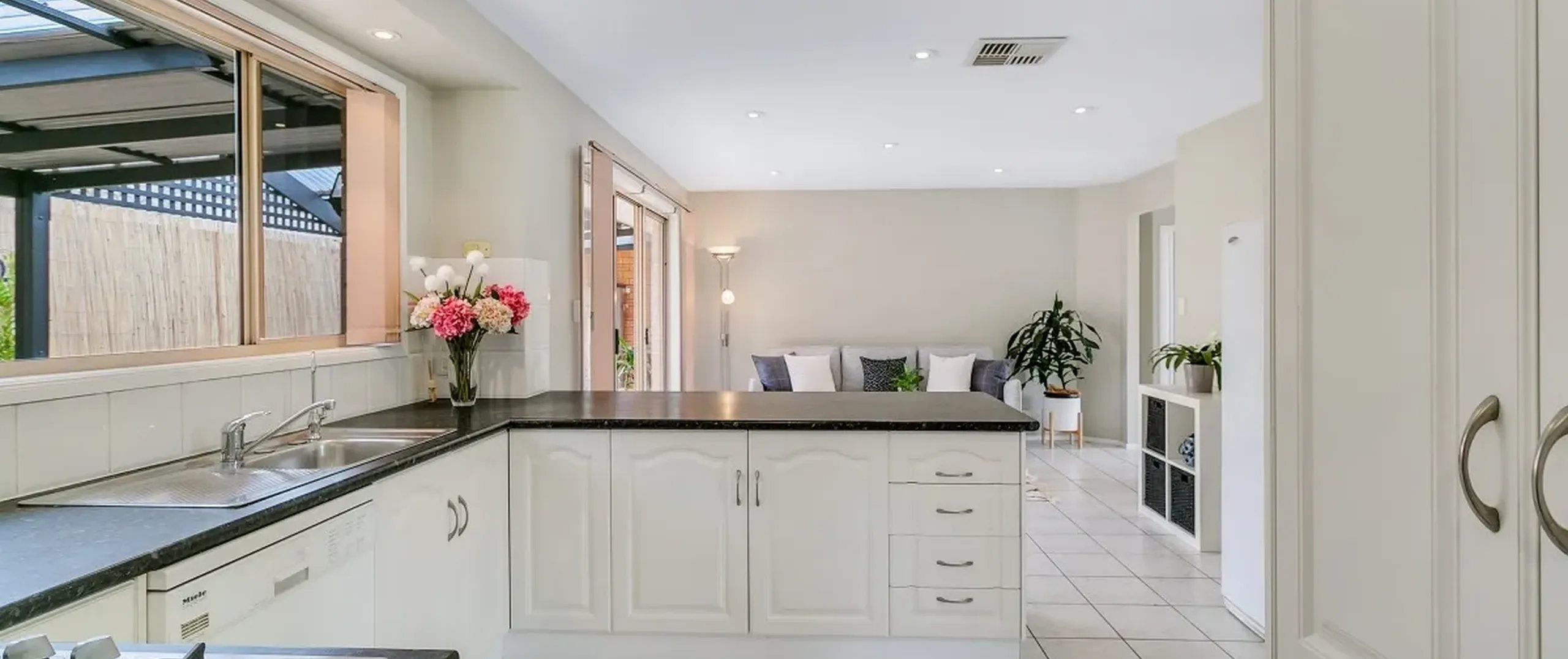- Modern kitchen with gas cooktop, Miele dishwasher, ample bench and cupboard space, and breakfast bar