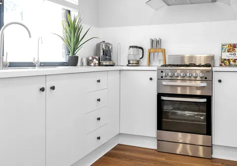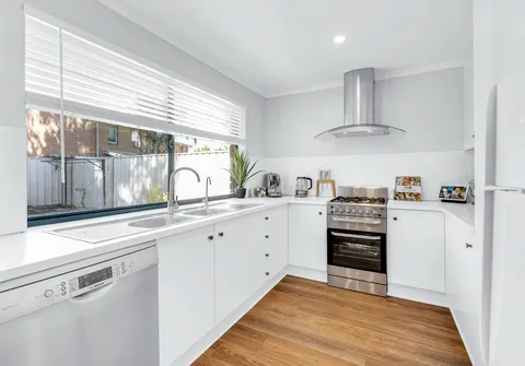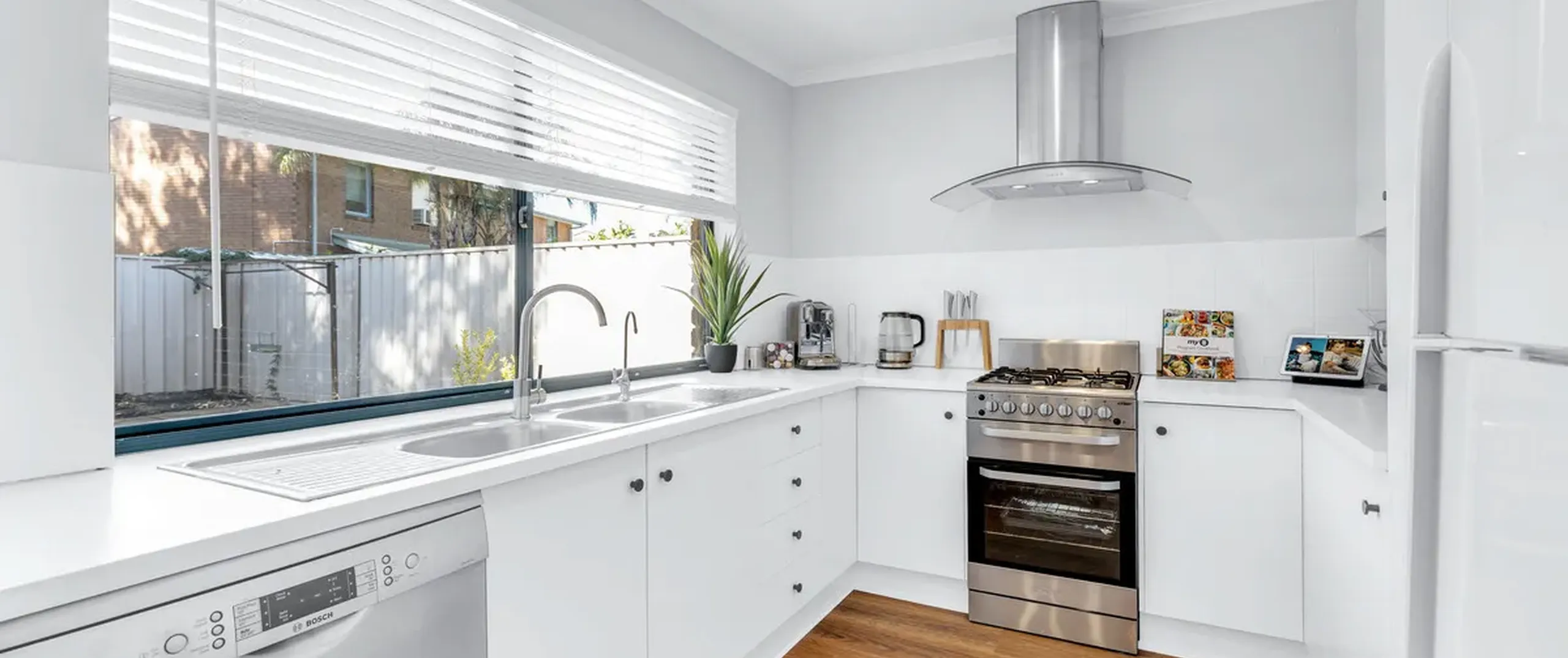 - Light filled kitchen with stainless steel appliances and bench space, overlooking the backyard