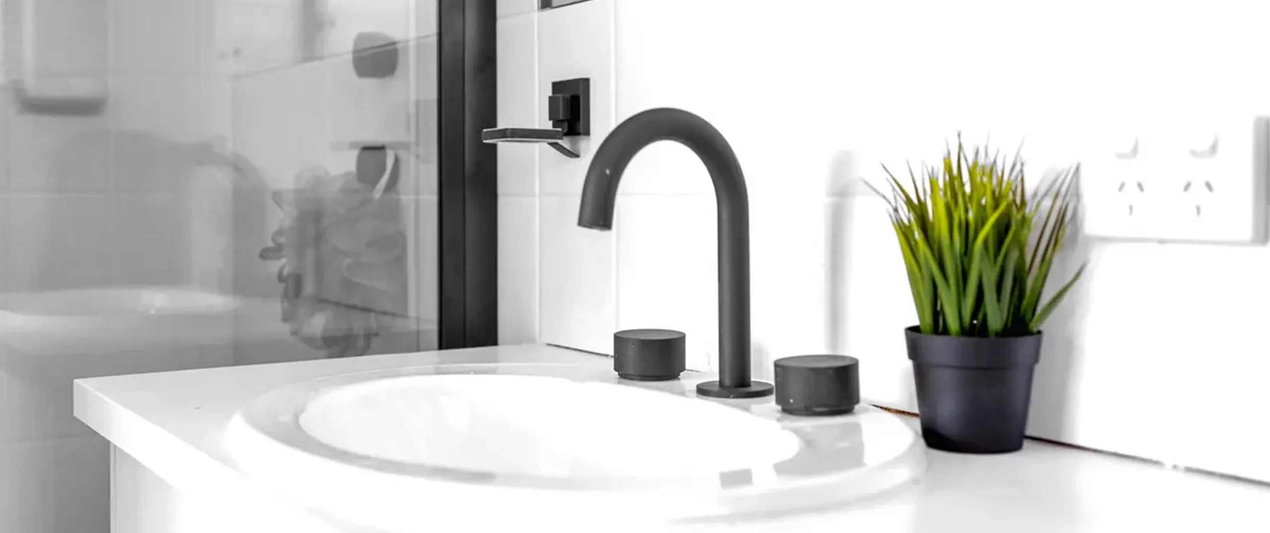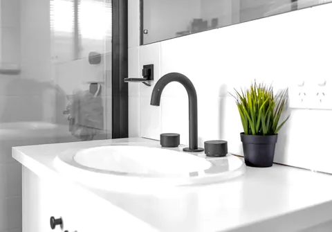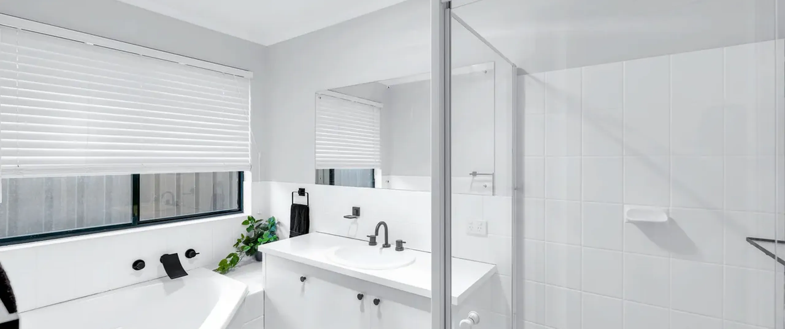 - Modern main bathroom with large bath and separate shower, featuring chic black tapware throughout