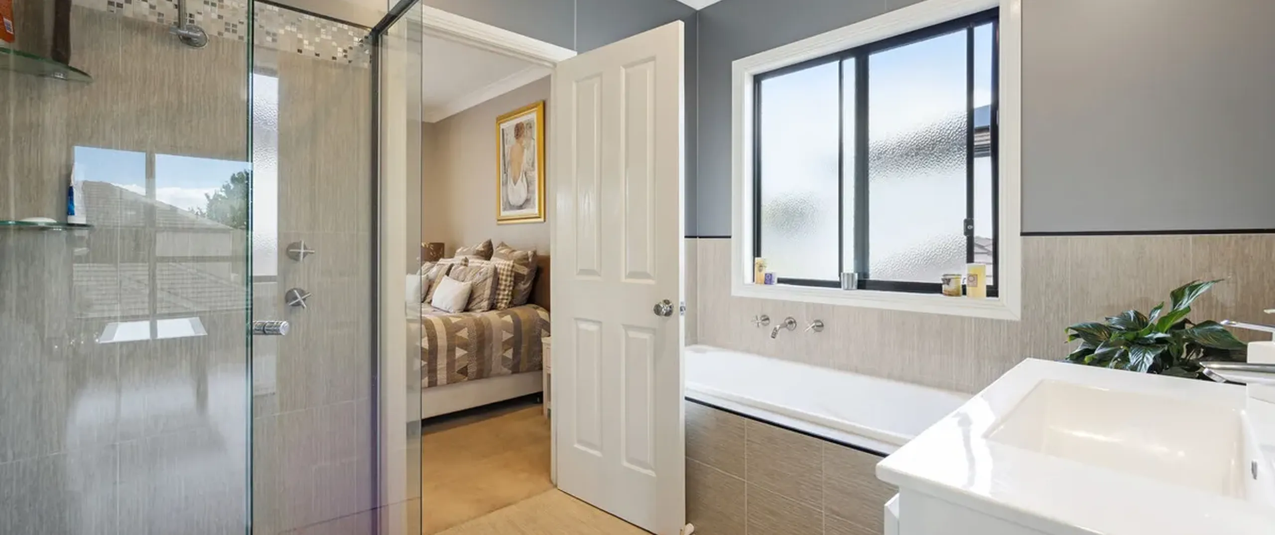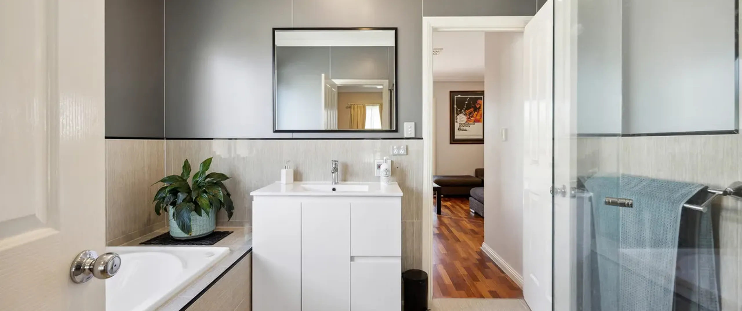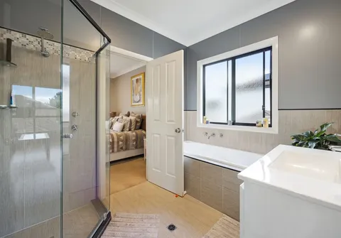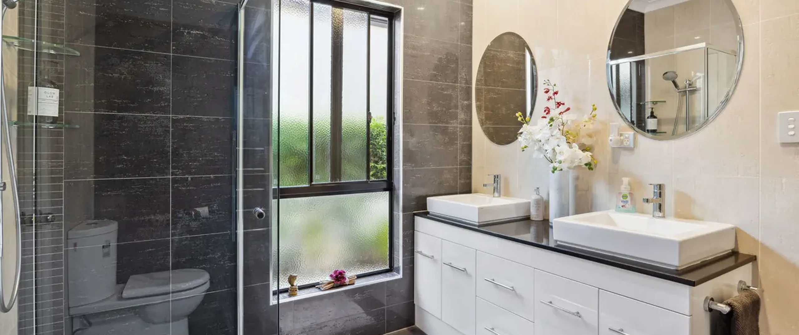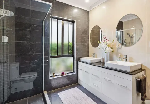 - Sleek bathroom with dual basins, toilet and shower, compete with floor-to-ceiling tiles