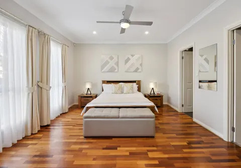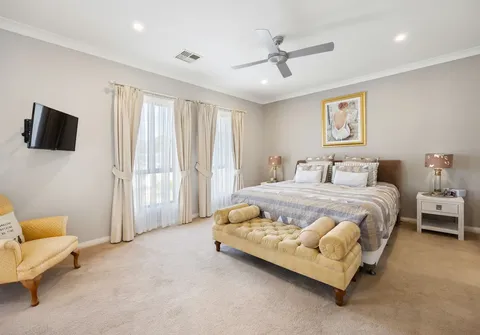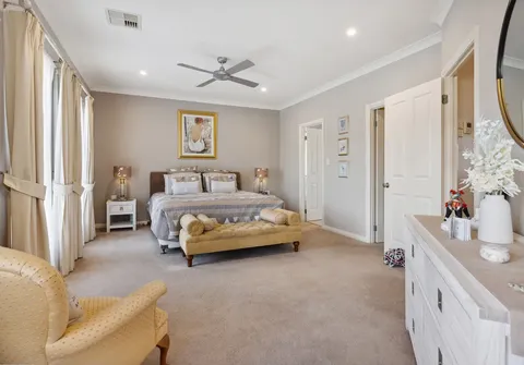 - Commodious master suite complete with ceiling fan, walk-in robe, built-in robe, balcony access and access to the luxe bathroom with bath, shower and separate toilet