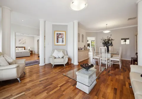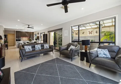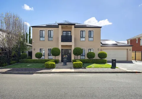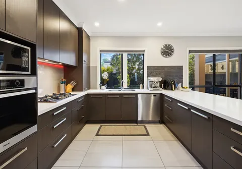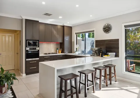 As you approach, the beautifully manicured front garden sets the stage for what awaits inside. Upon stepping through the entrance, a wide hallway welcomes you, leading you past the elegant formal lounge and dining areas, seamlessly flowing into an inviting open-plan kitchen, living, and meals area. The chef's kitchen is a culinary haven, featuring top-of-the-line appliances, a walk-in pantry, ample cupboard space, expansive benchtops, and a desirable breakfast bar.