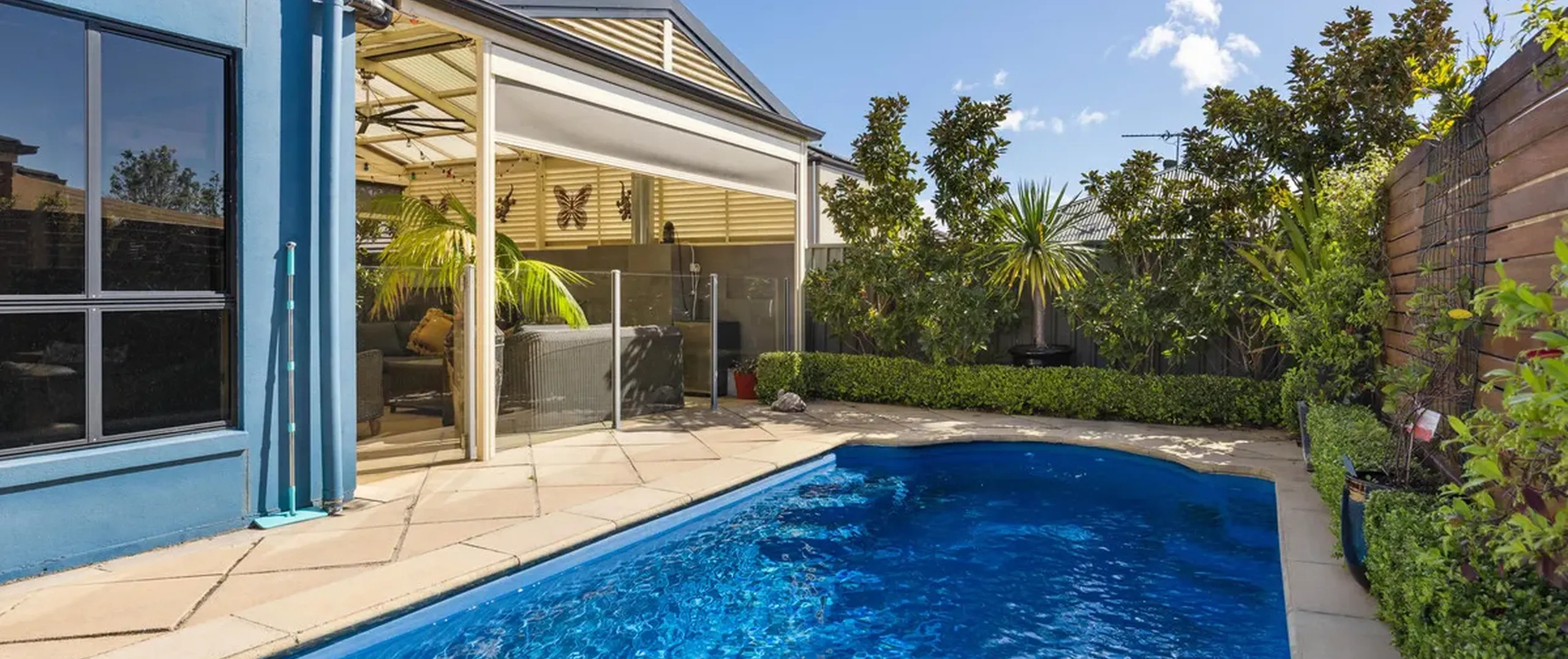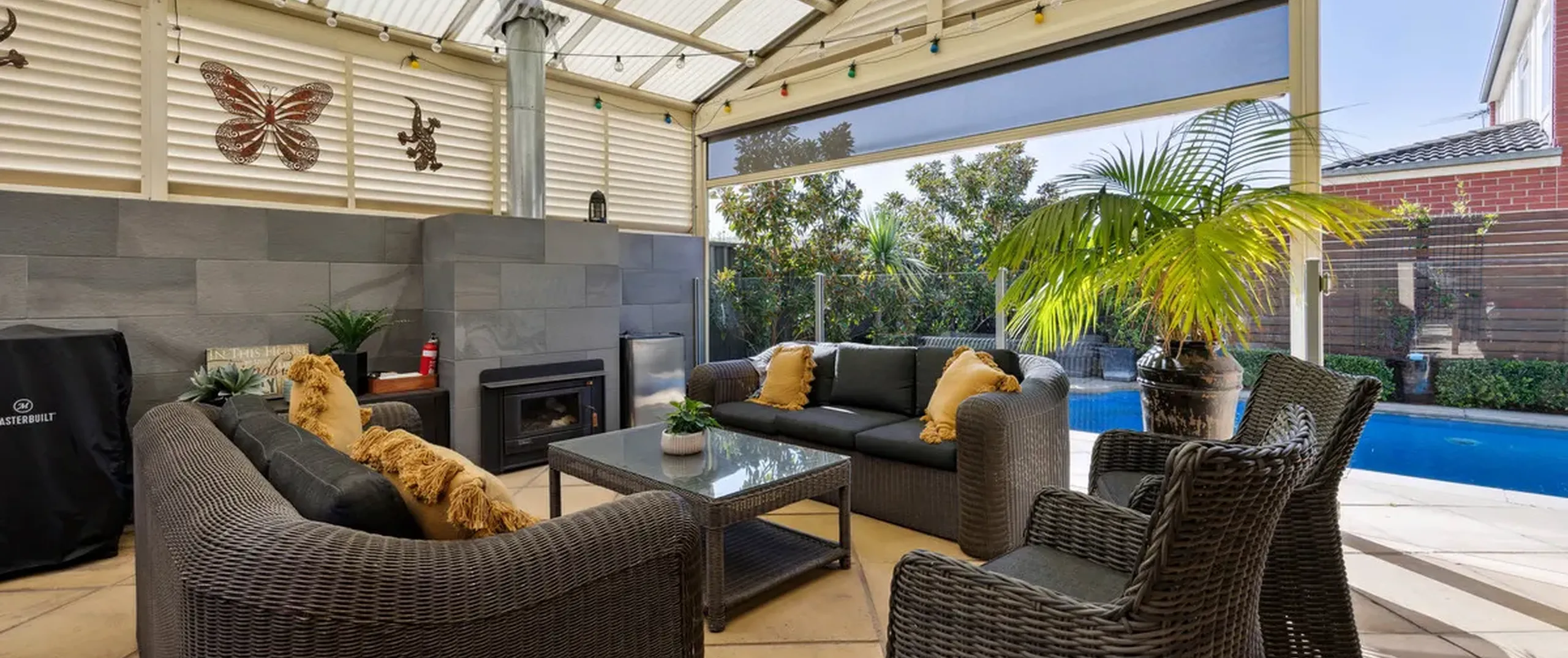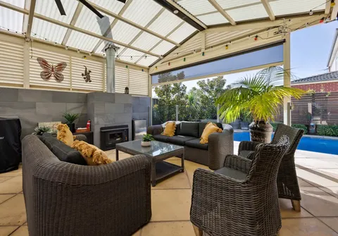 - Outdoor entertaining area with pitched roof pergola, complete with café blinds and ceiling fan, overlooking the backyard, perfect for hosting guests in the warmer months