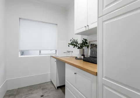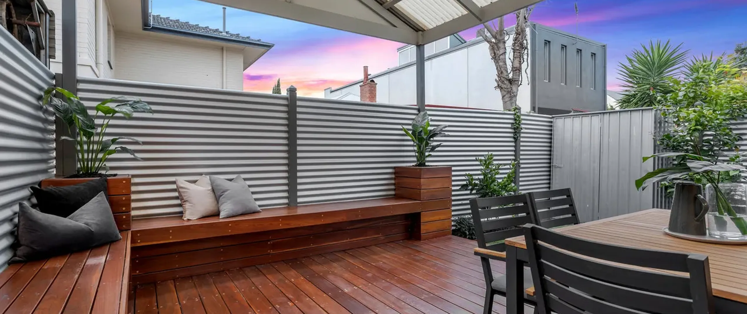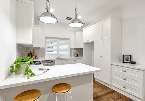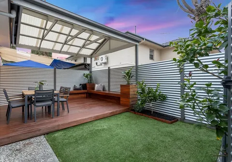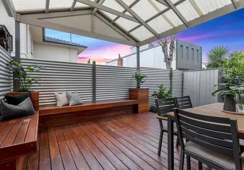 The layout offers two large bedrooms, both with built-in robes, wide entry hallway and impeccably renovated throughout. The light-filled lounge is illuminated by a statement pendant light, plantation shutters and there is a beautiful dining room that flows into the upgraded kitchen with Caesarstone benchtops. A large separate laundry, stunning bathroom with feature floor to ceiling tiles, and a study nook complete the internal layout of this home while French doors open out to the private pergola with Red Gum decking and seating.