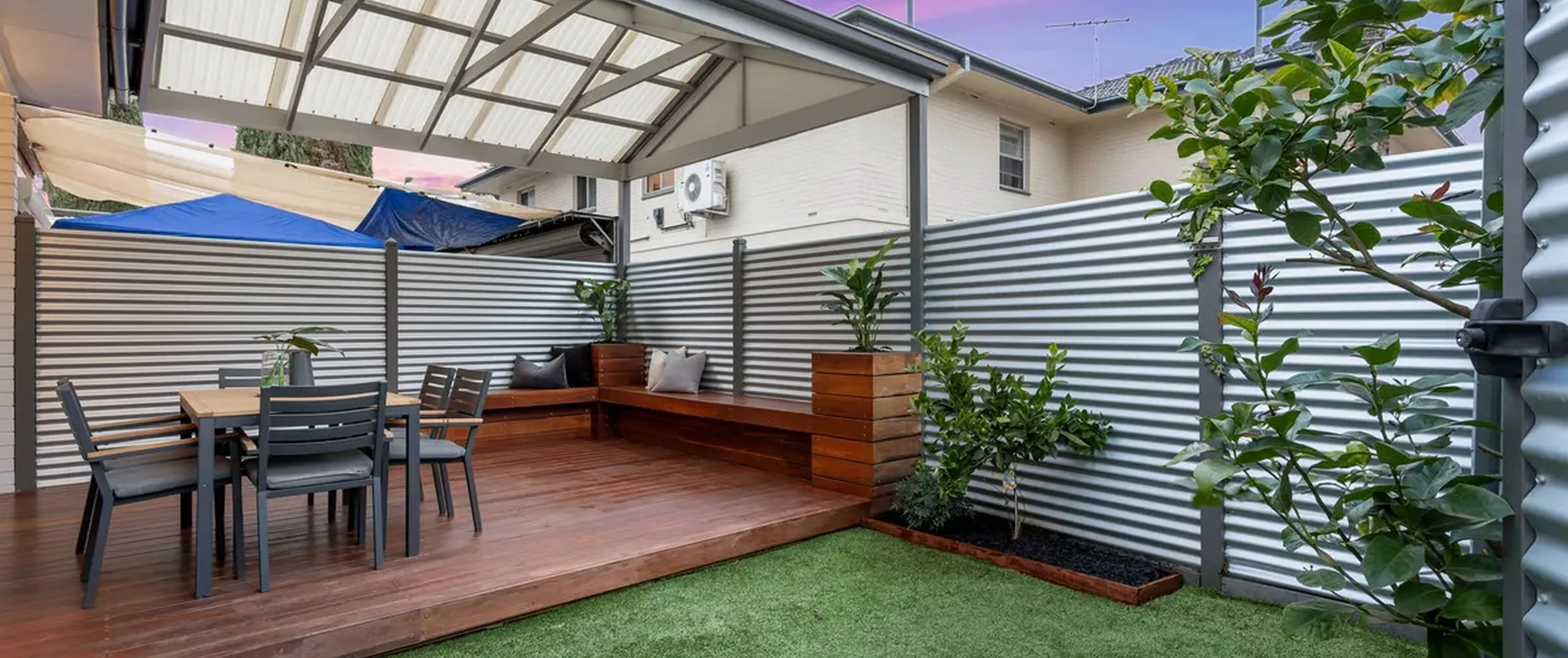 - Impressive outdoor entertaining area with all weather pergola, Red Gum timber decking and built-in seating
