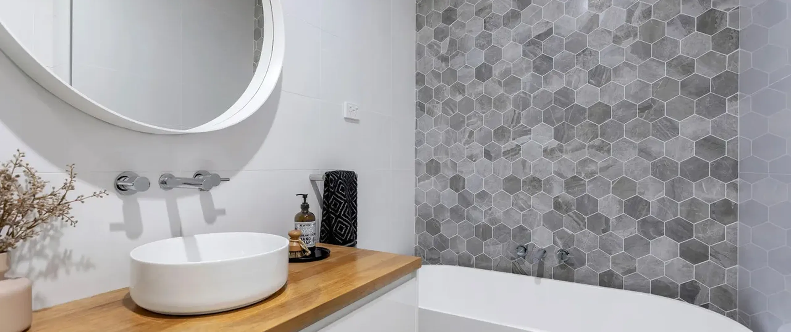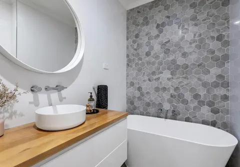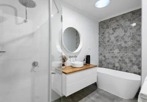 - Modern main bathroom with bathtub, separate shower and floor to ceiling tiles