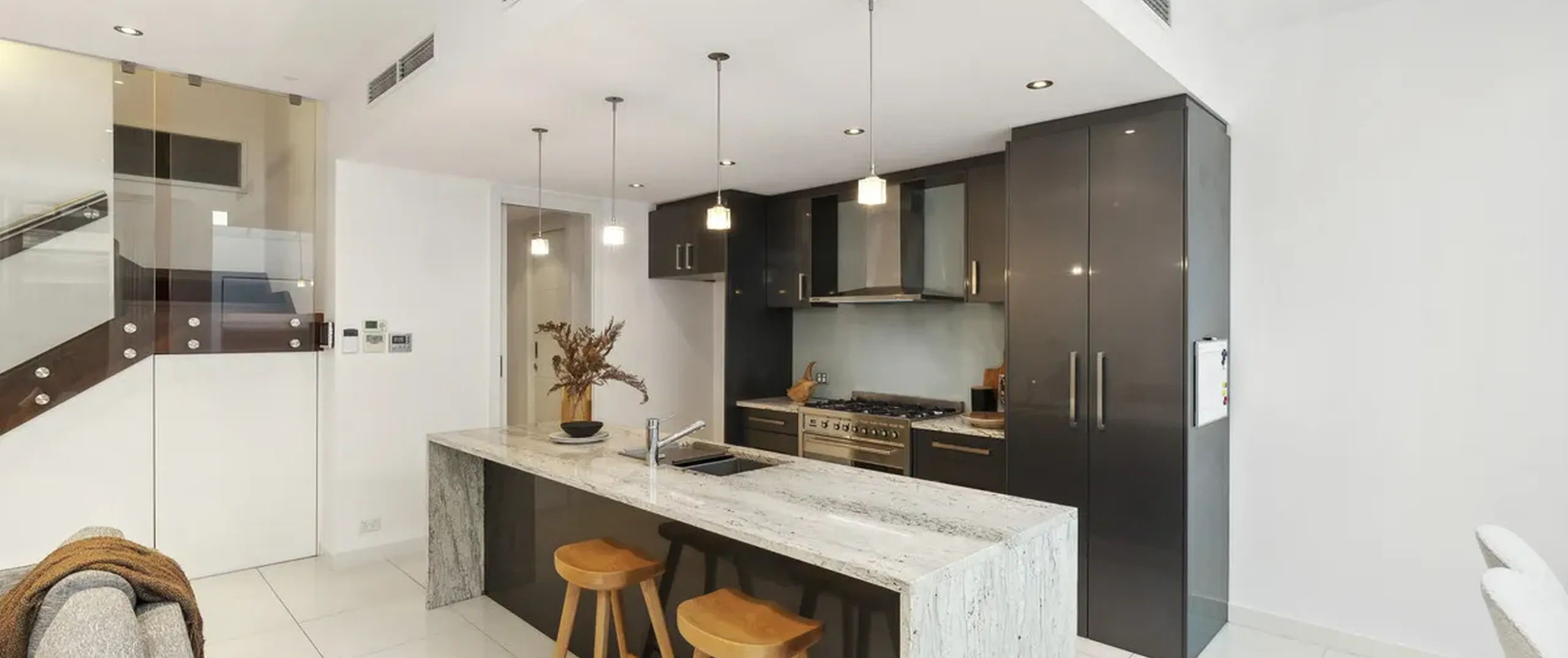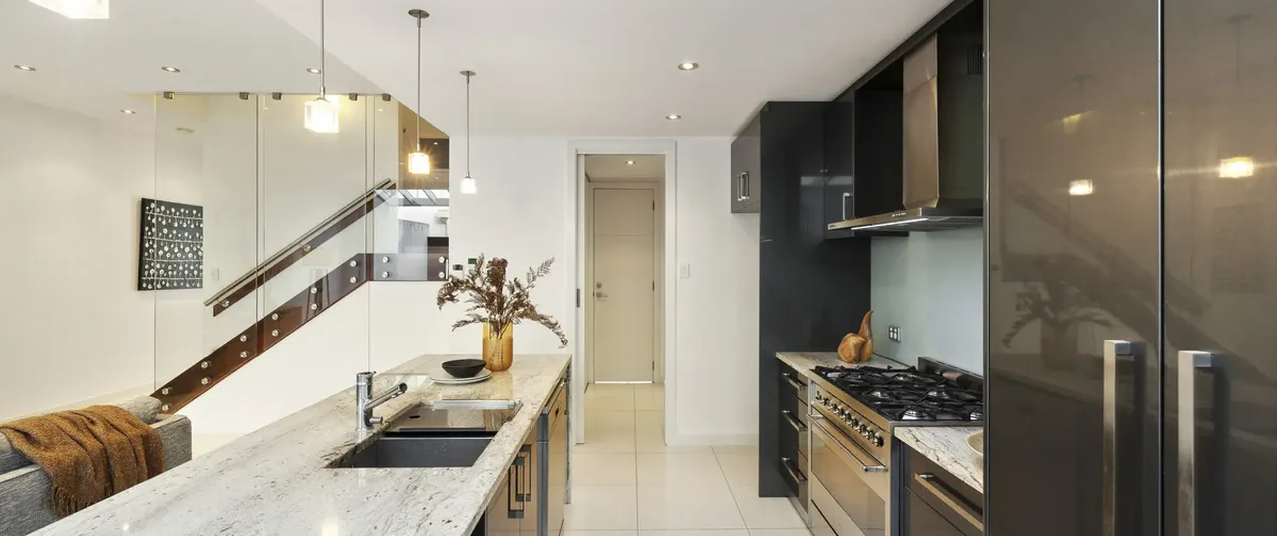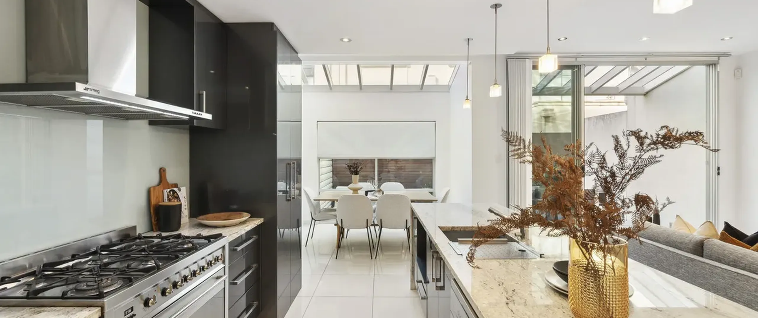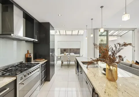 - Pristine, modern kitchen with stone benchtops, 6 burner gas cooktop, oven and dishwasher