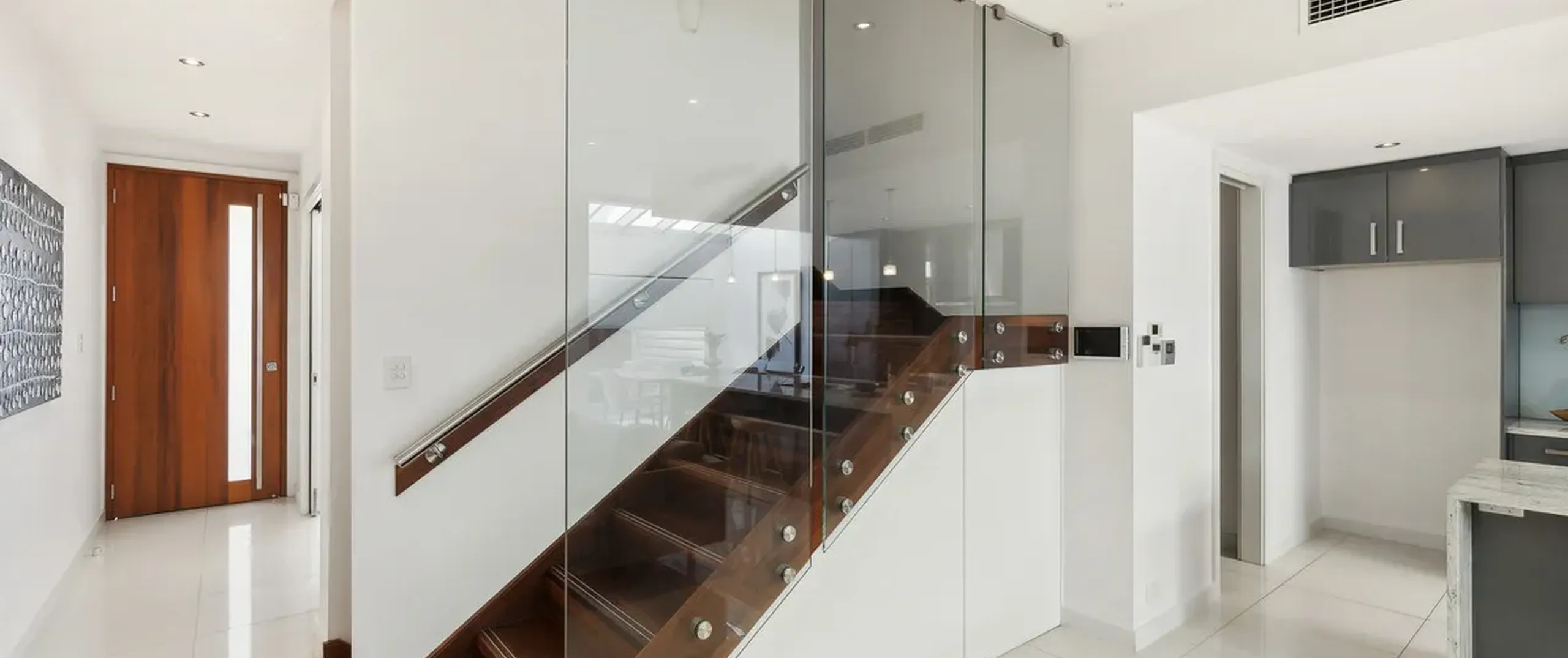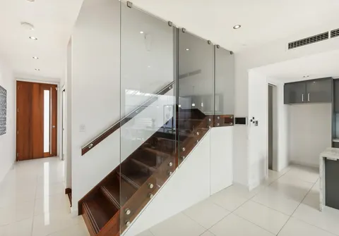 - Elegant Jarrah hardwood staircase with glass balustrades