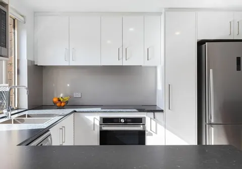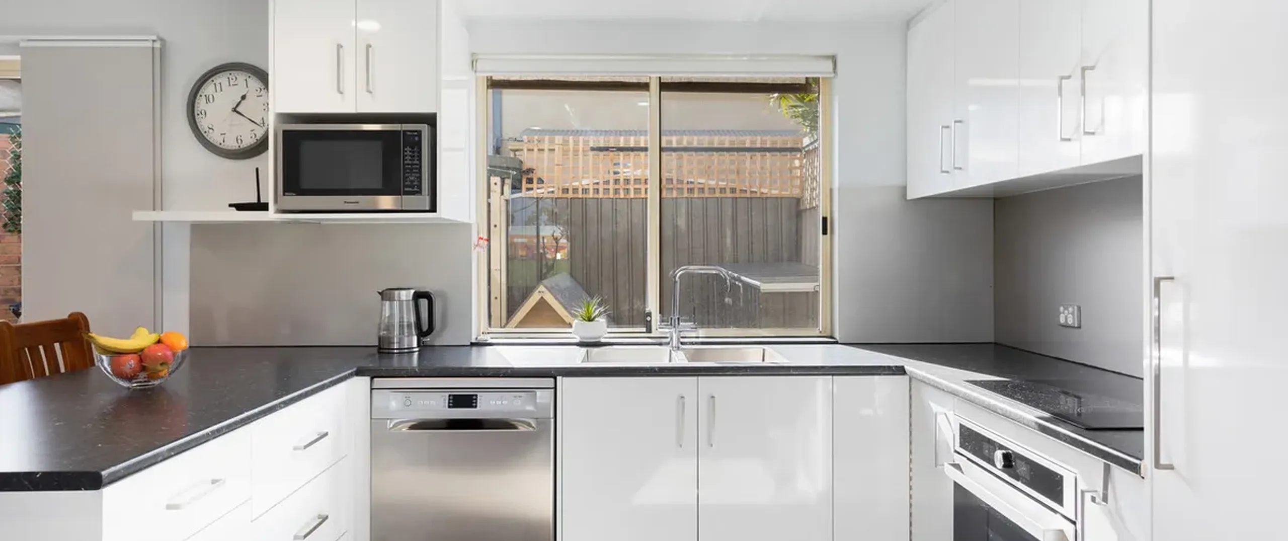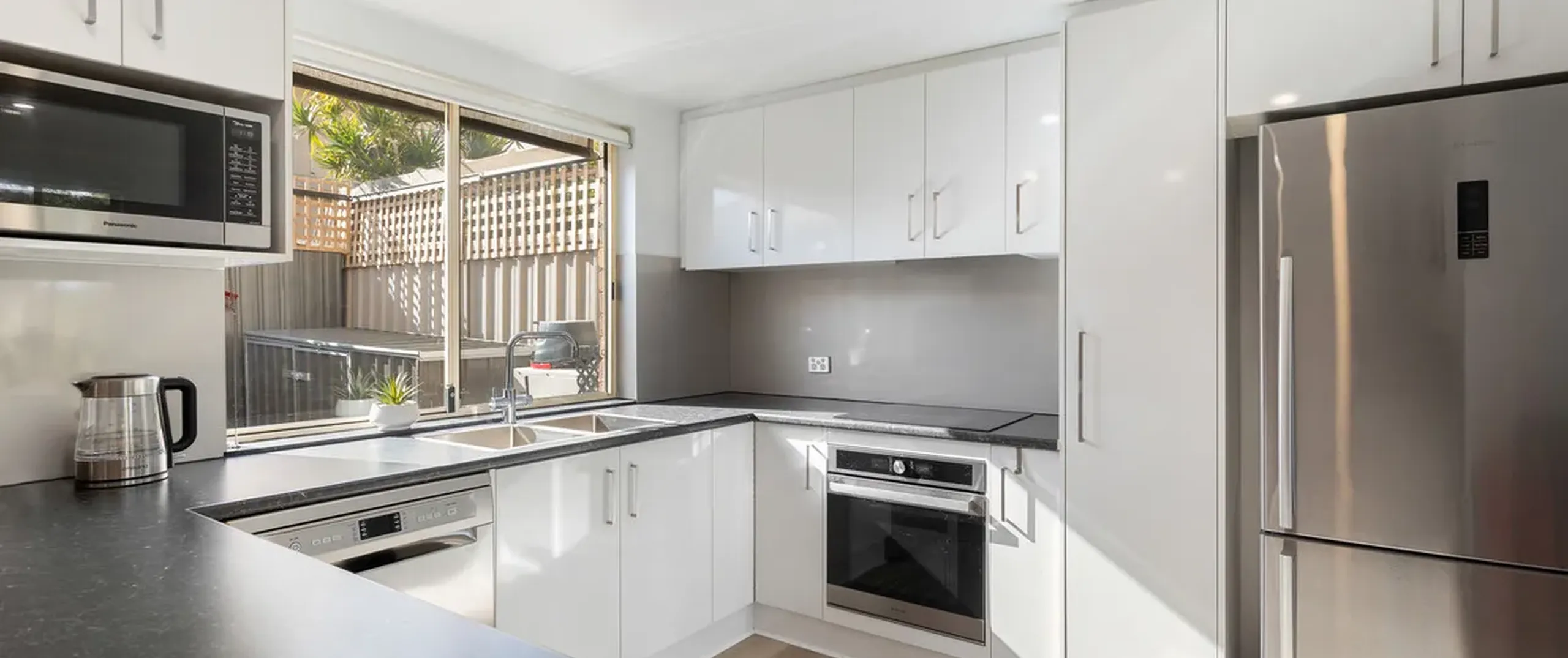 - Modern kitchen featuring stainless steel appliances and ample cupboard and bench space