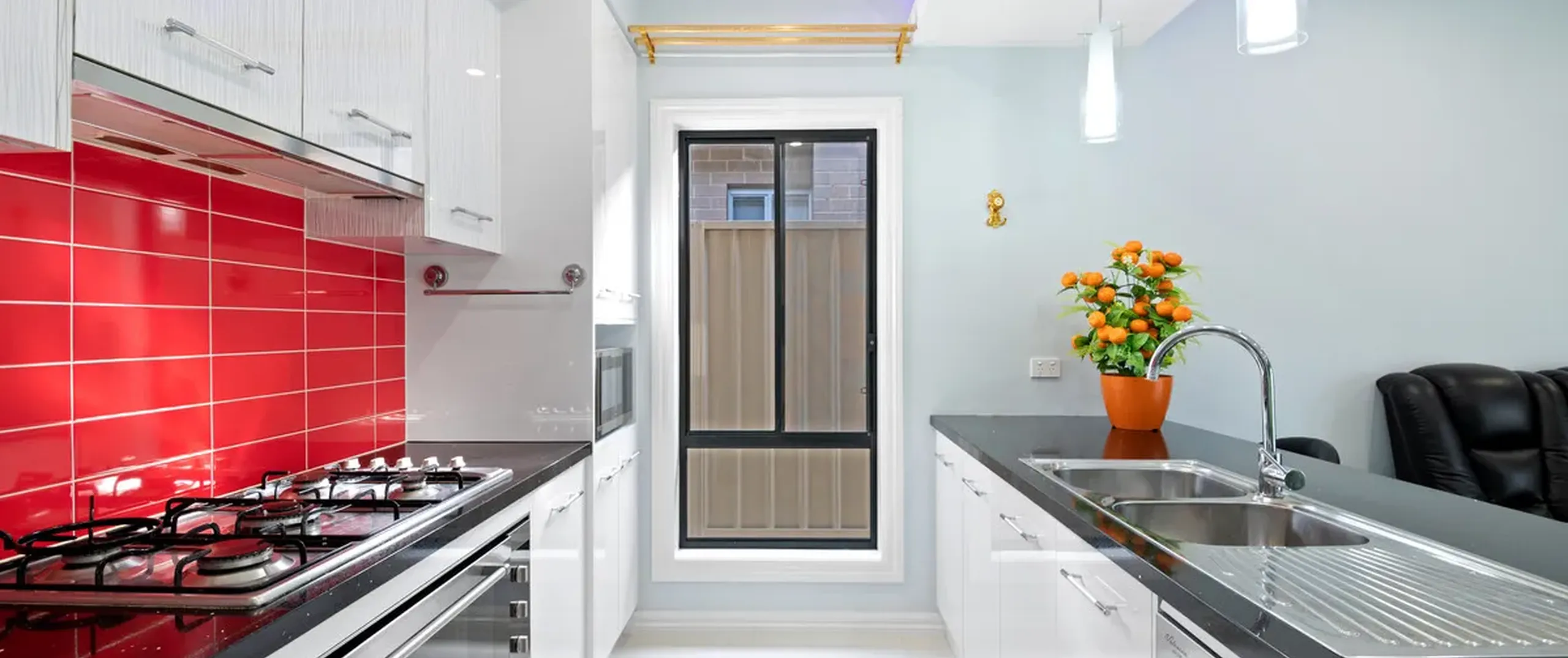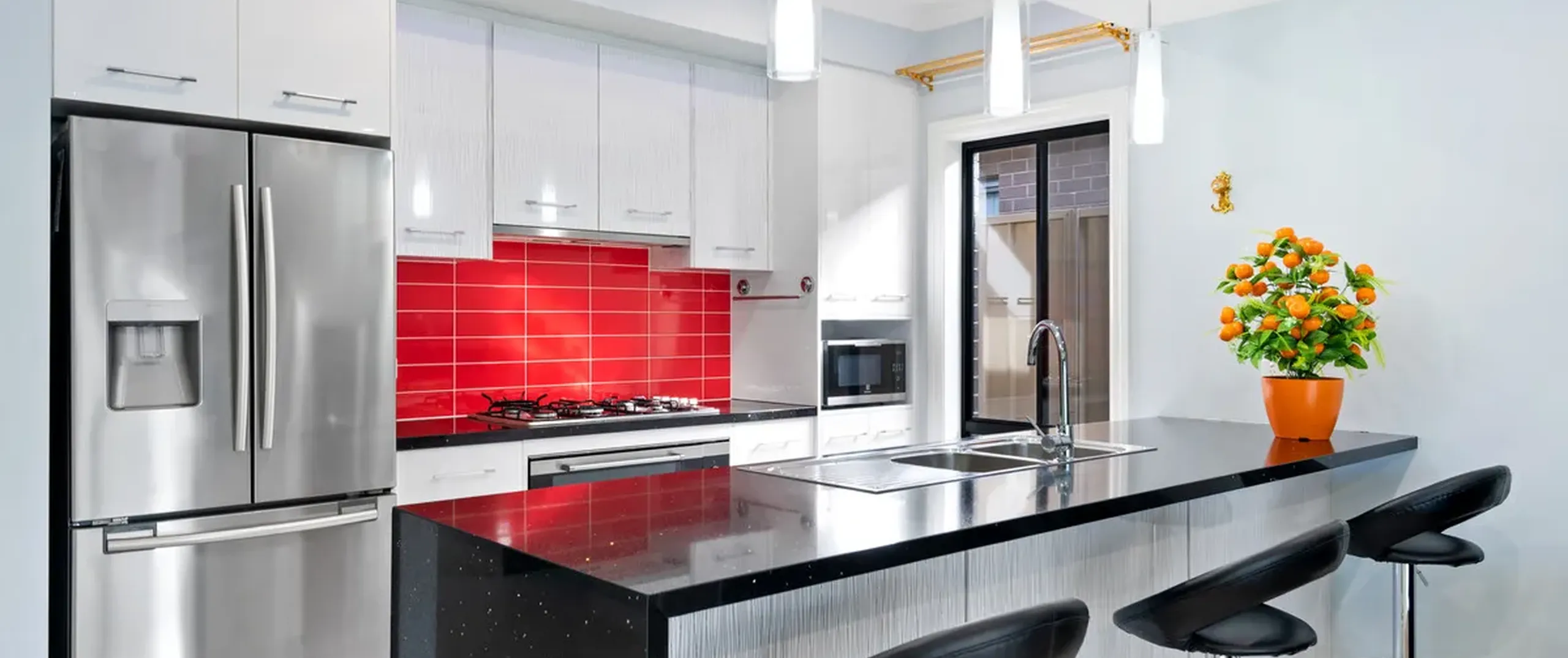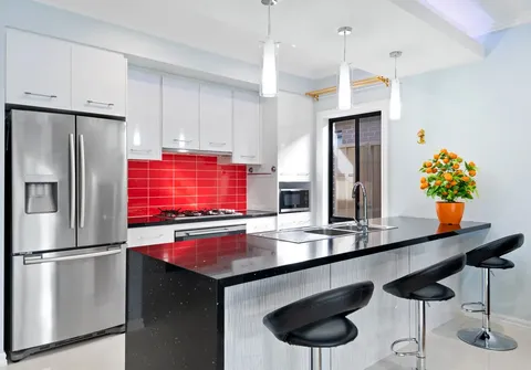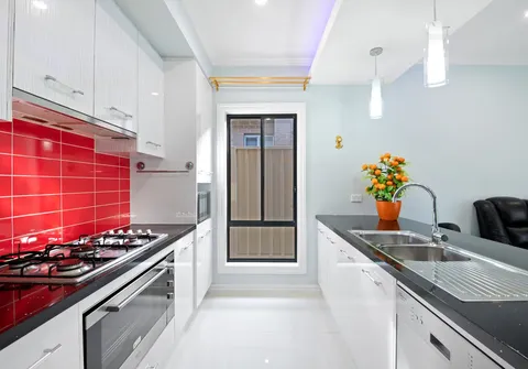 - Modern kitchen with stainless steel appliances, gas cooktop, dishwasher, stone benchtops and waterfall breakfast bar