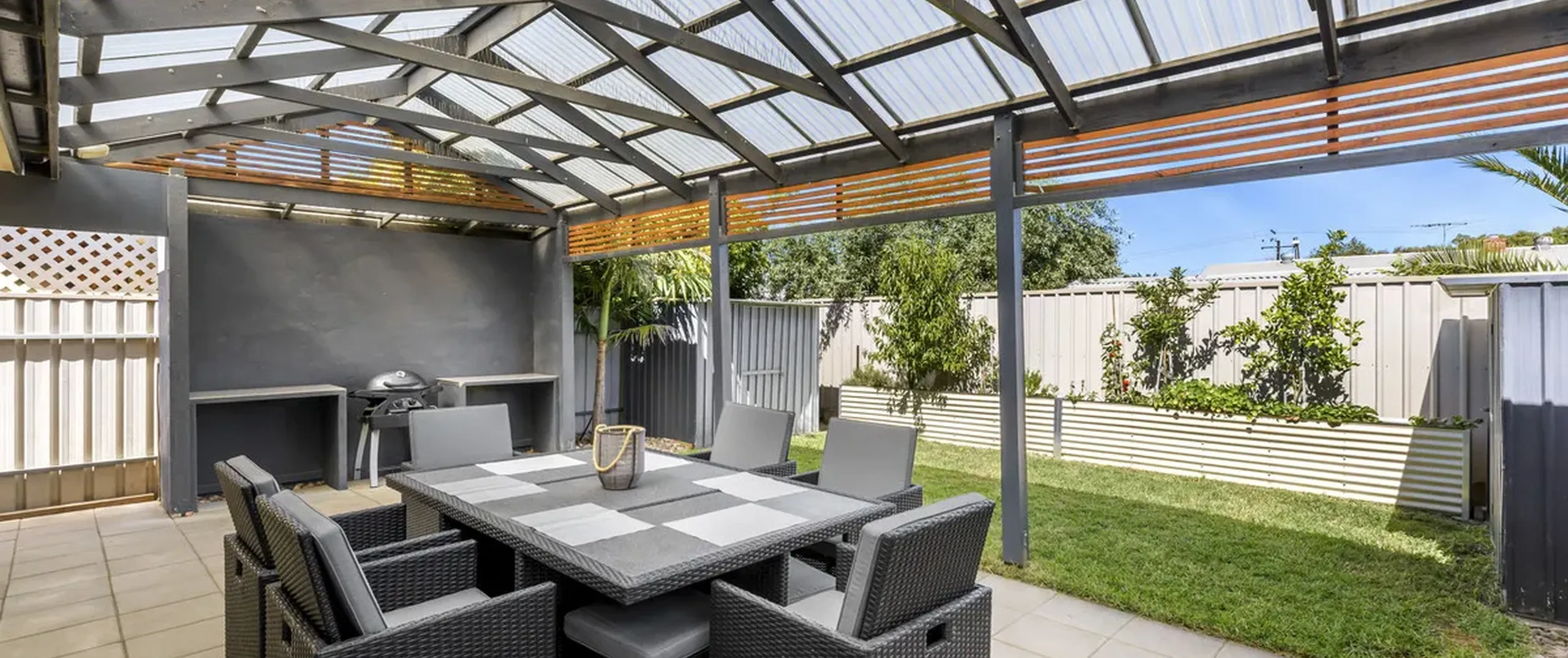 - Large outdoor entertaining area overlooking the backyard with well-kept gardens