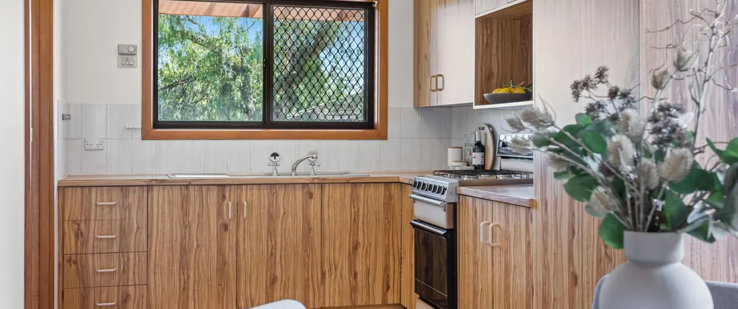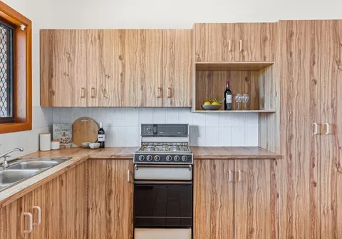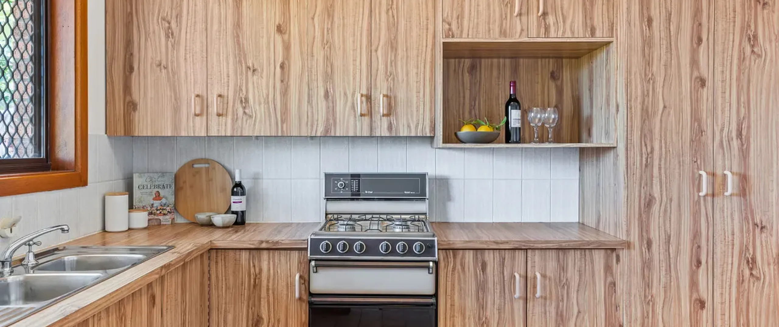 - Functional kitchen complete with gas cooktop and oven, with ample cupboard space