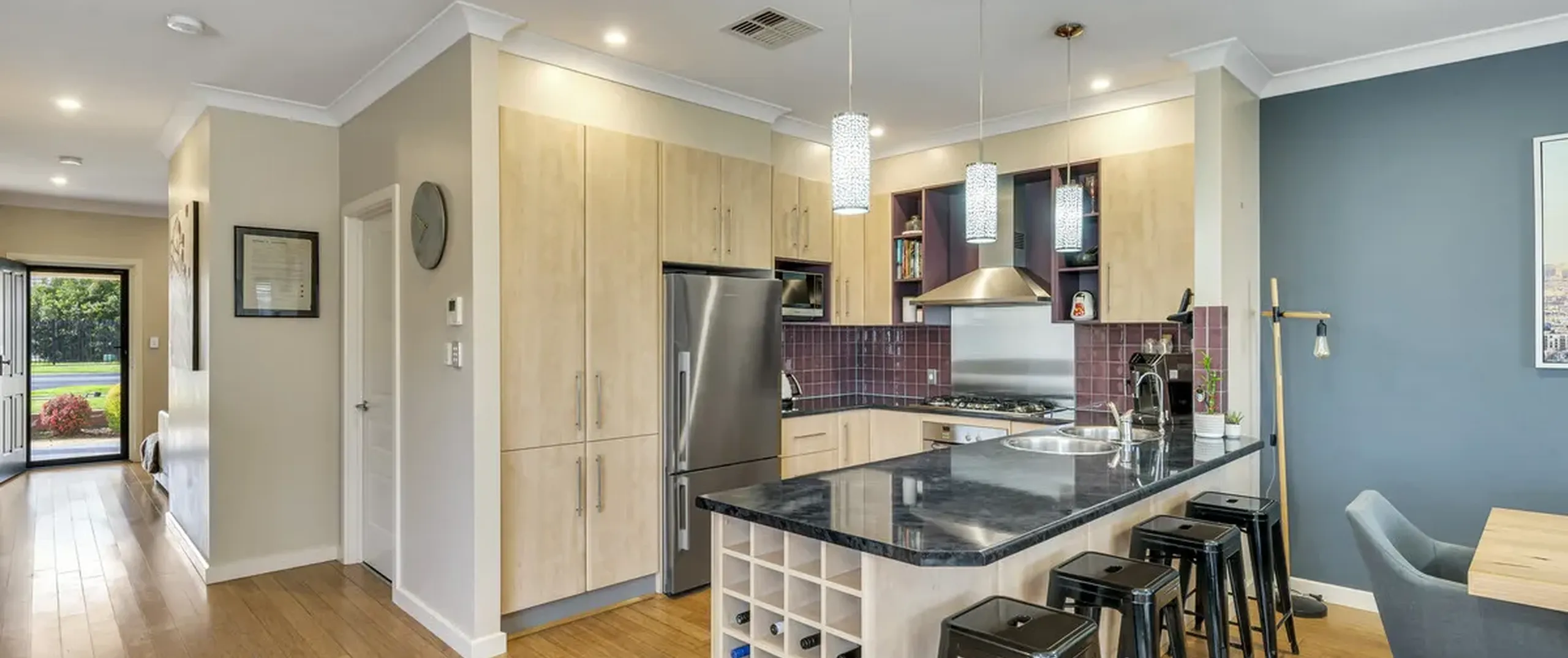 - Modern kitchen with ample cupboard and bench space and stainless steel appliances