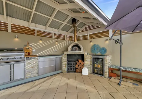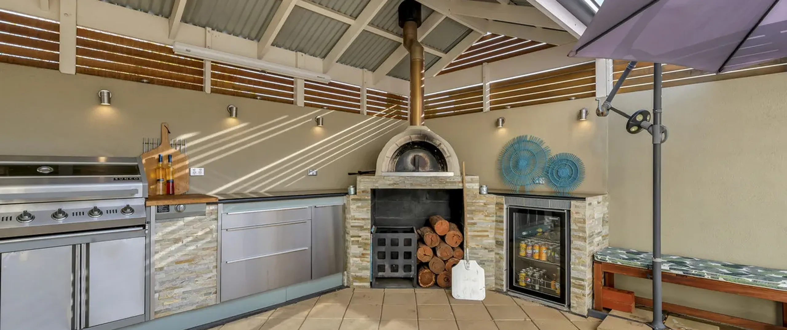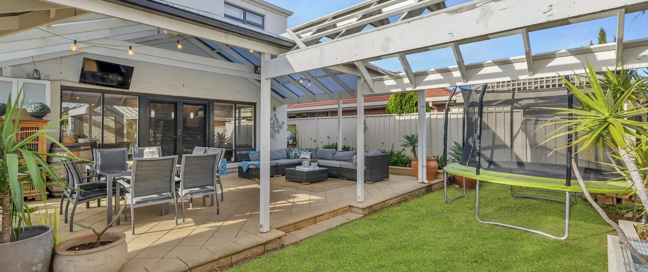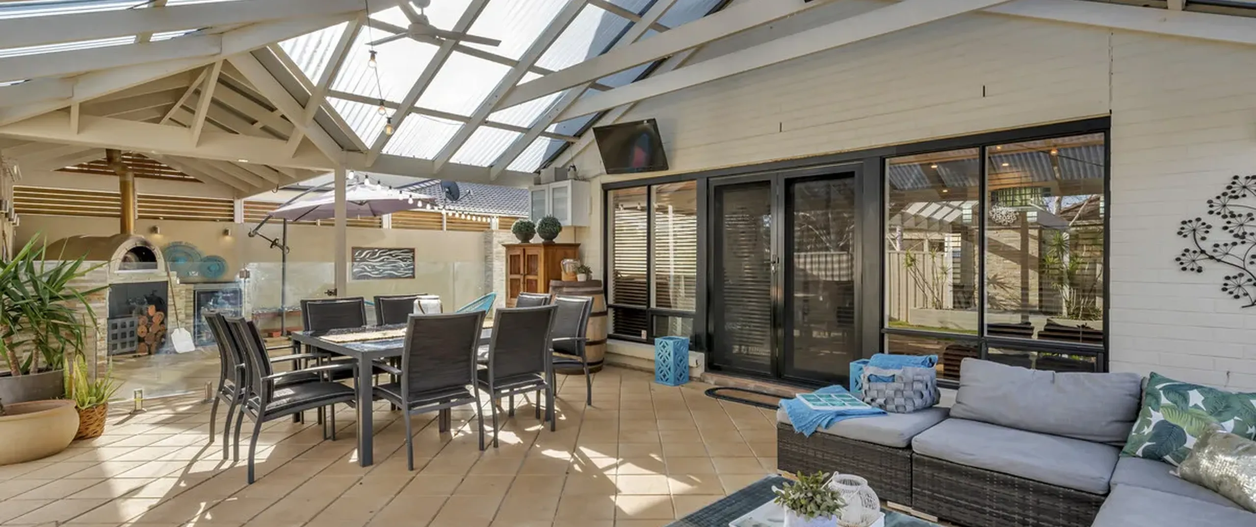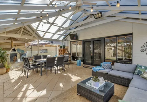 - Huge outdoor entertaining area with ceiling fans and pergola extension