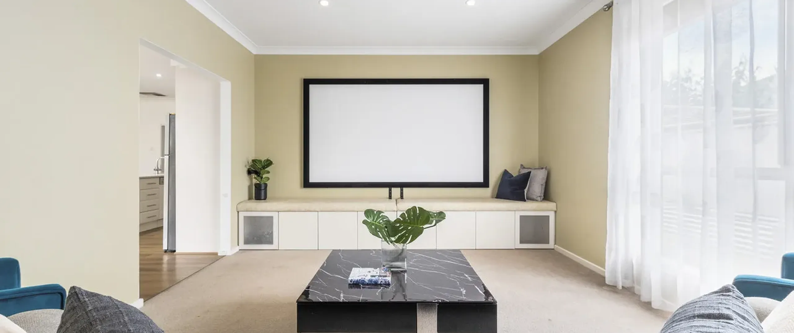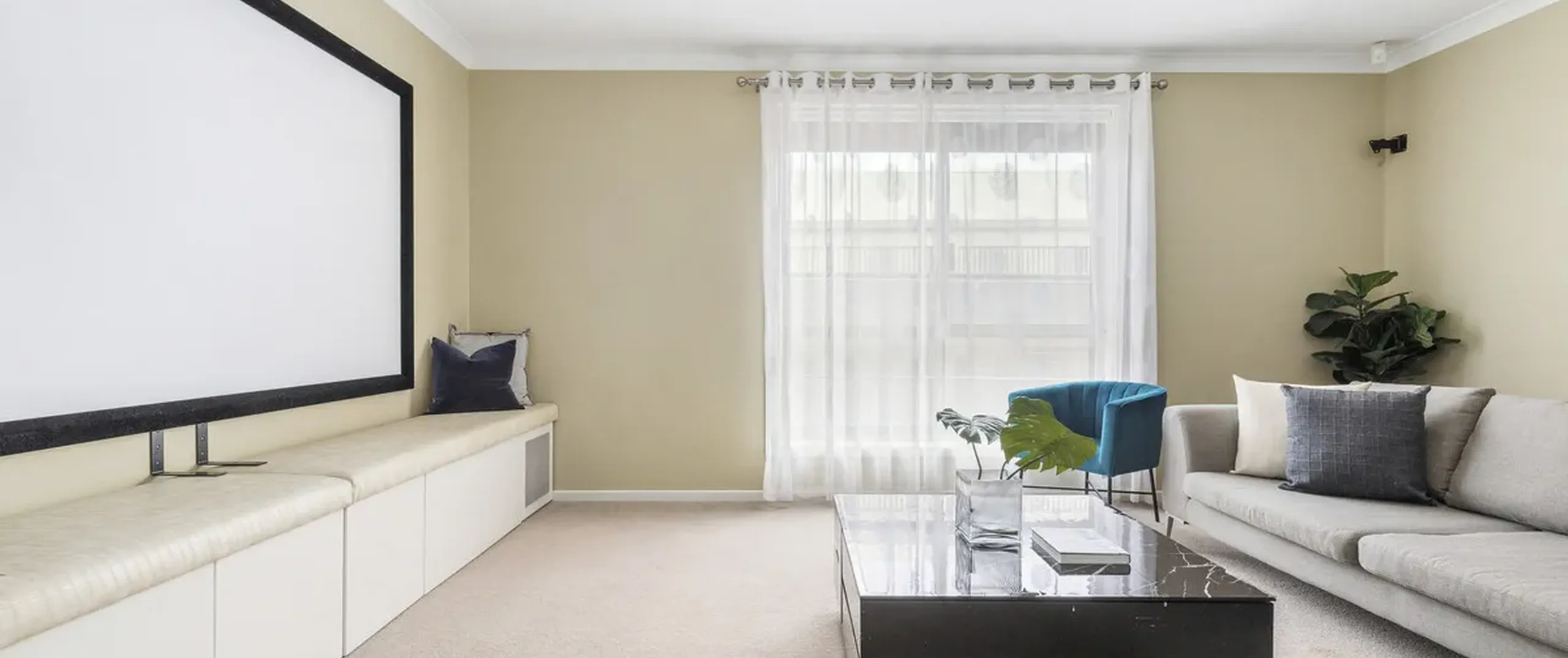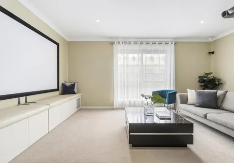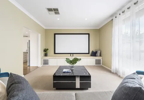At the heart of daily activities lies the captivating open-plan kitchen, meals, and family area. The kitchen, a timeless centrepiece, is sure to delight home chefs, while large graceful windows transform mealtime into a delightful experience. Alternatively, your family can choose to escape to the cosy home theatre.