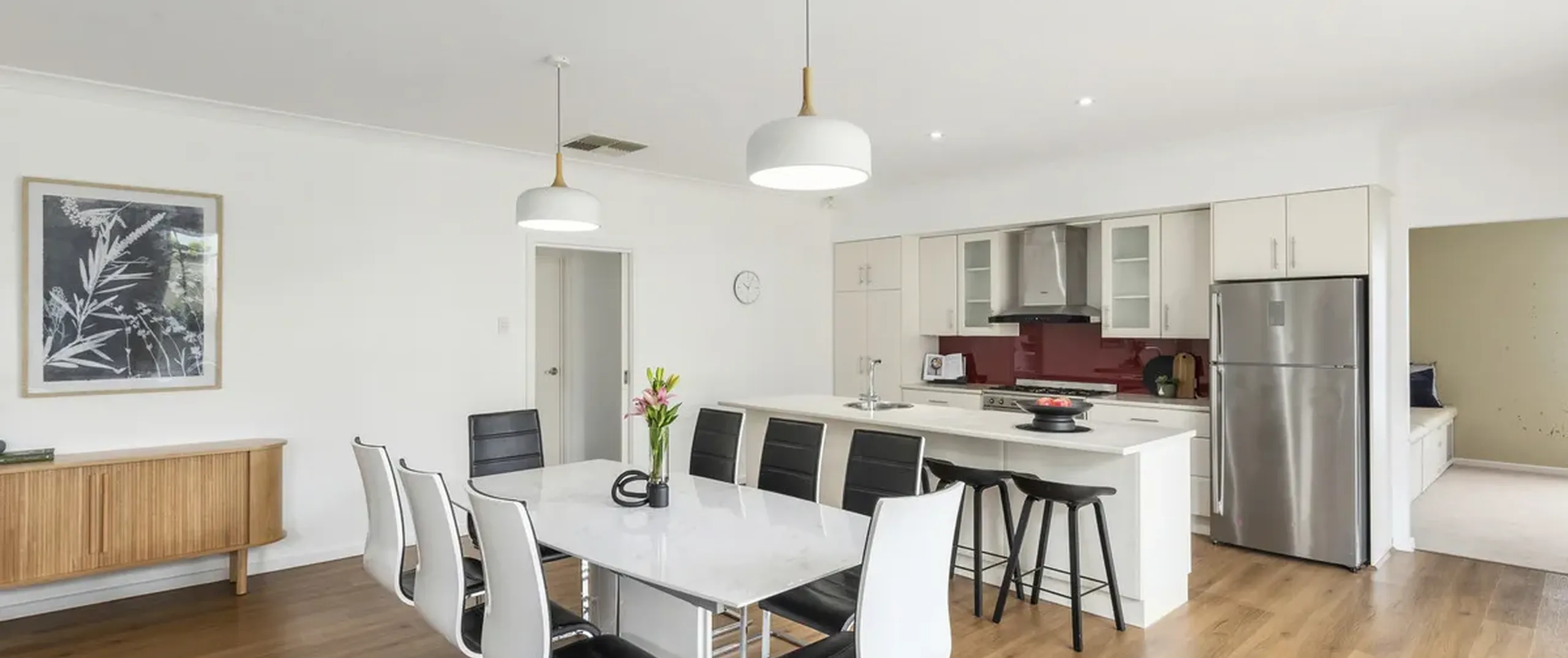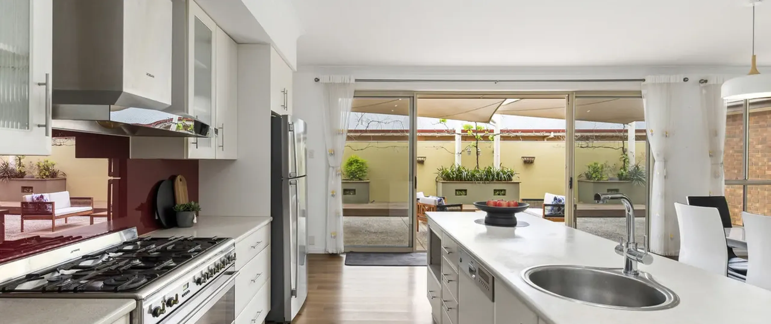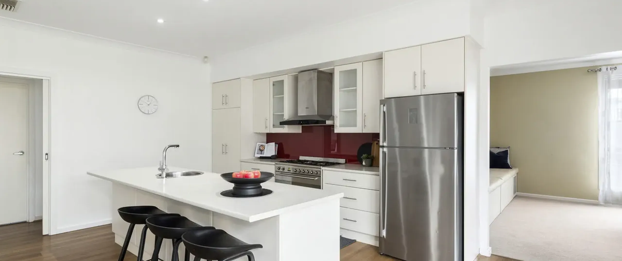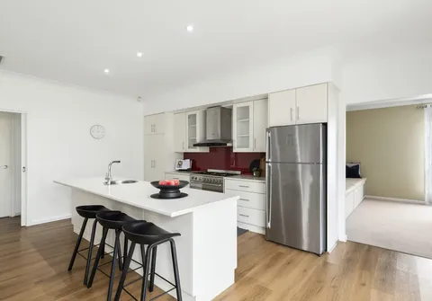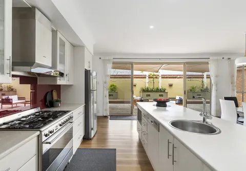 - Timeless kitchen with integrated dishwasher, 900mm gas cooktop, glass splash back, ample bench and cupboard space and breakfast bar