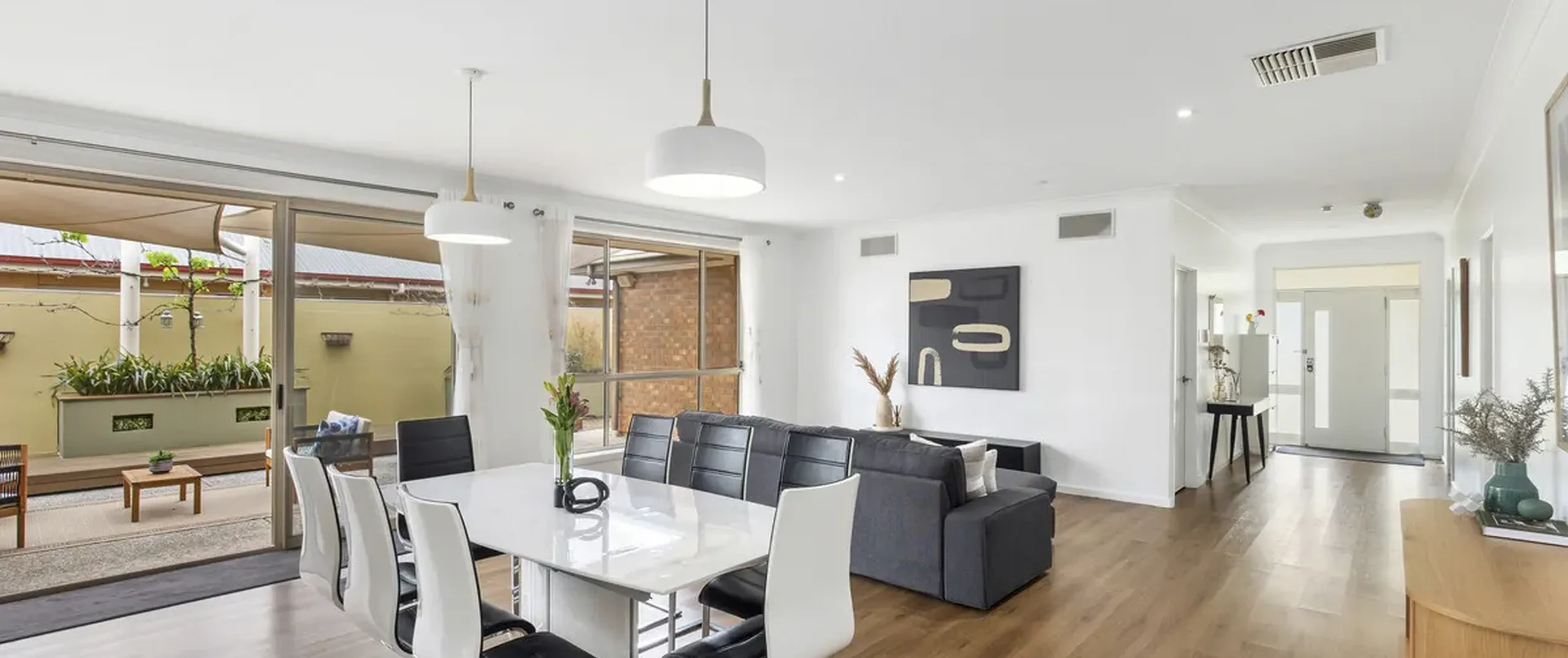 This residence truly embodies the concept of a lifestyle home, where indoor living spaces seamlessly transition into the impressive outdoor entertaining area. Here, a spacious area featuring two large shade sails takes centre stage, accompanied by an outdoor deck and lush greenery. This inviting space sets the scene for hosting memorable gatherings against a charming backdrop.