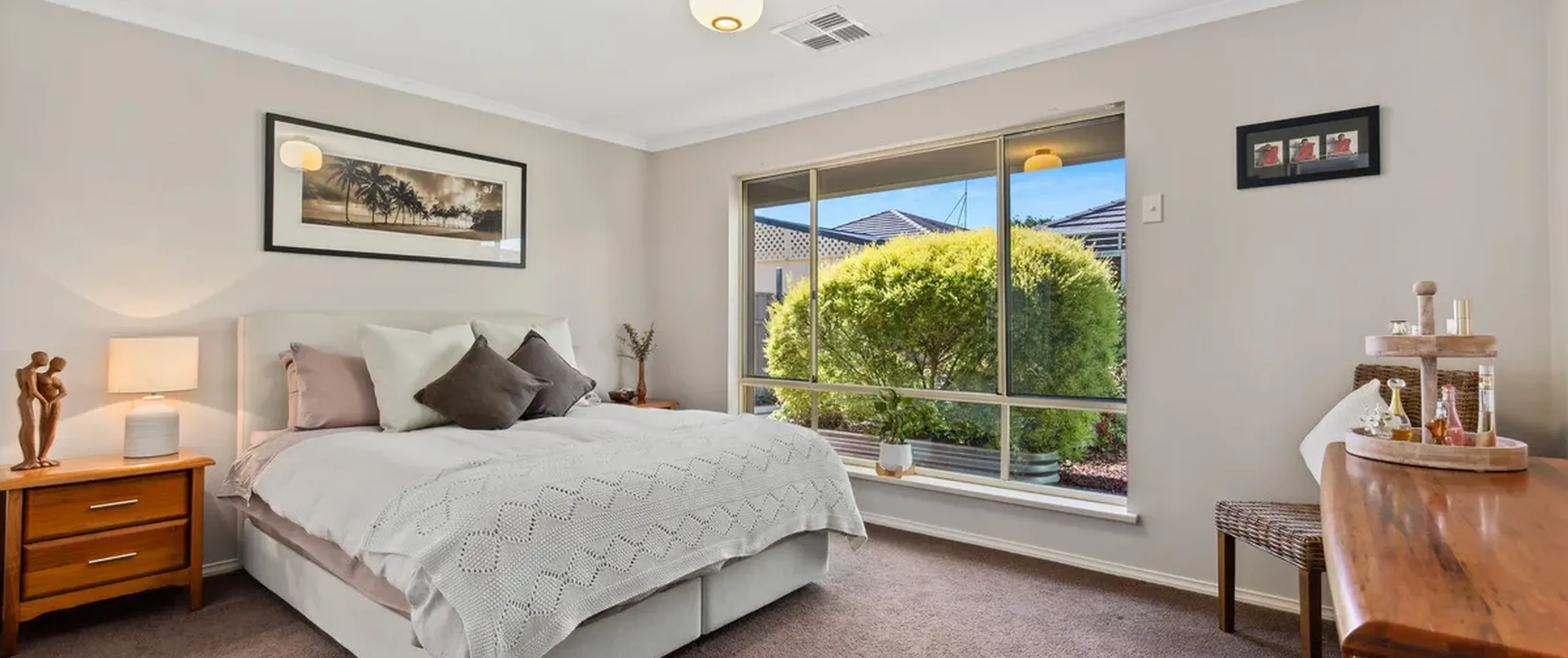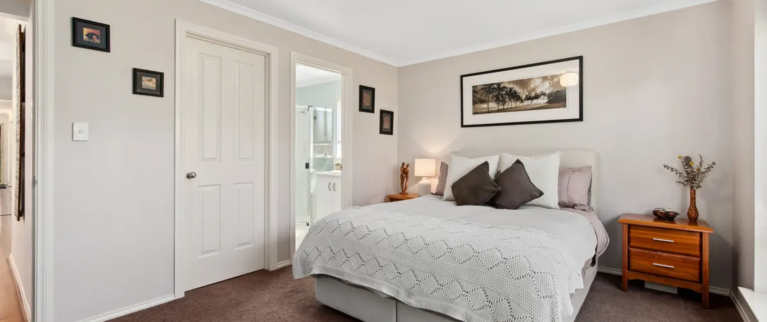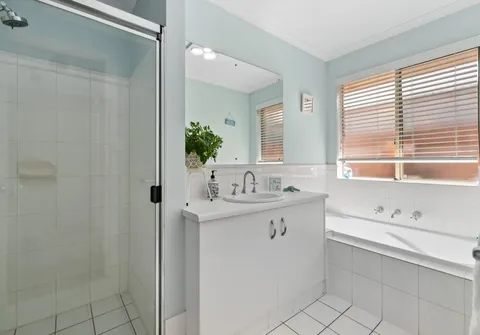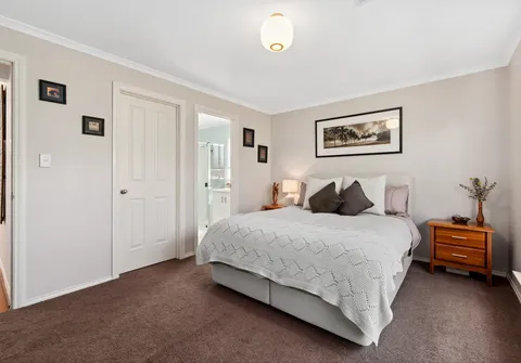 The generous proportions extend to the bedrooms, with the master suite featuring a walk-in robe and an ensuite. The guest bedrooms share easy access to the contemporary main bathroom, adorned in warm neutral tones.