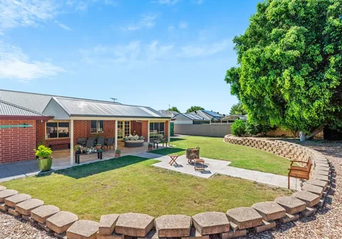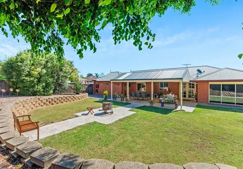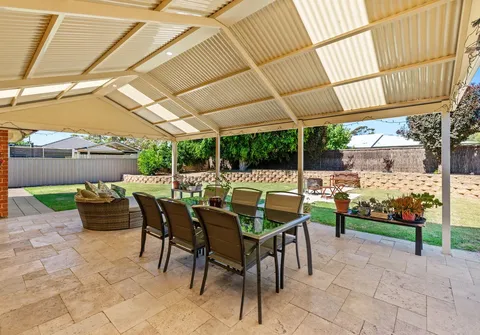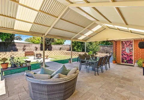 Beautiful French doors lead to the substantial yard, which provides ample space for relaxation and entertainment, complete with a huge pitched roof pergola and stunning travertine paving. This expansive area is perfect for hosting memorable occasions, offering room for entertaining, family activities, pets, gardening, and more. With the addition of a fire pit area, raised garden beds, a garden shed, various citrus trees, and a mix of grassed and paved areas, it provides a perfect blend of shade and sun.