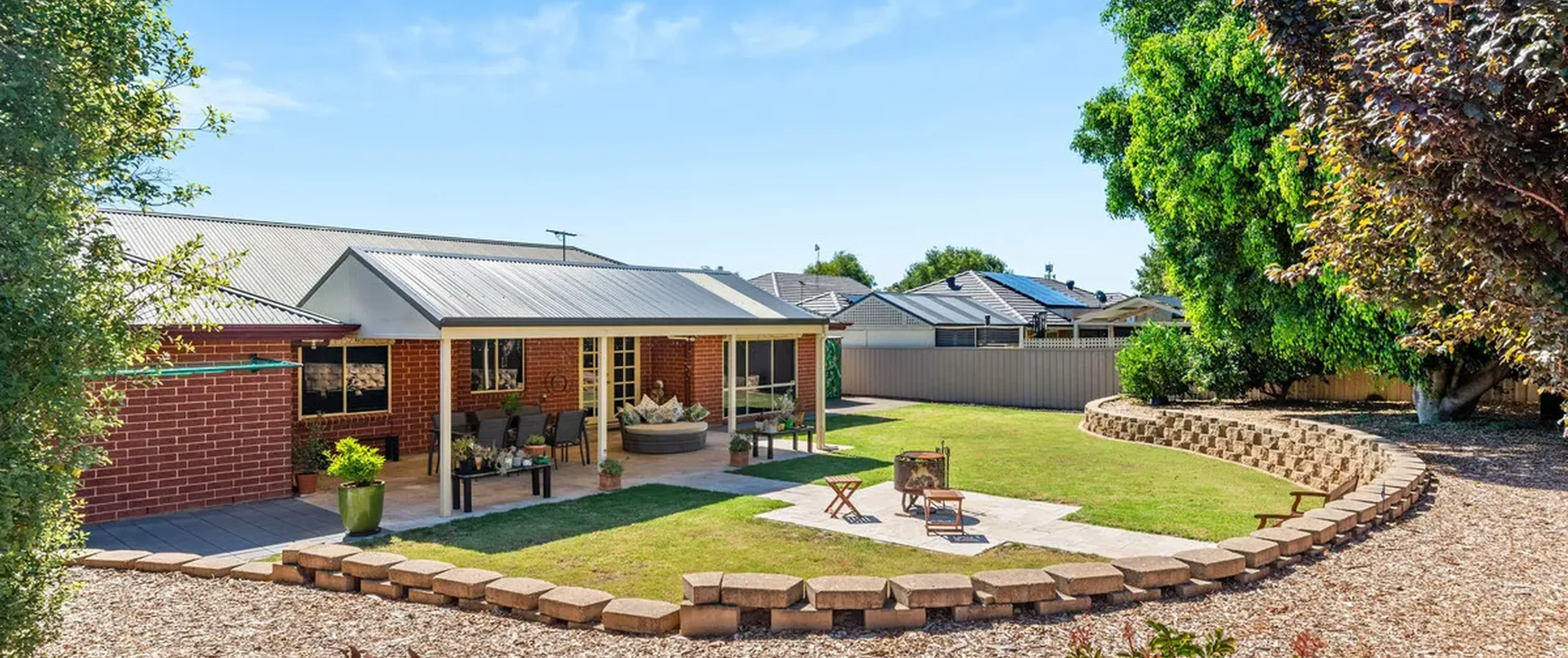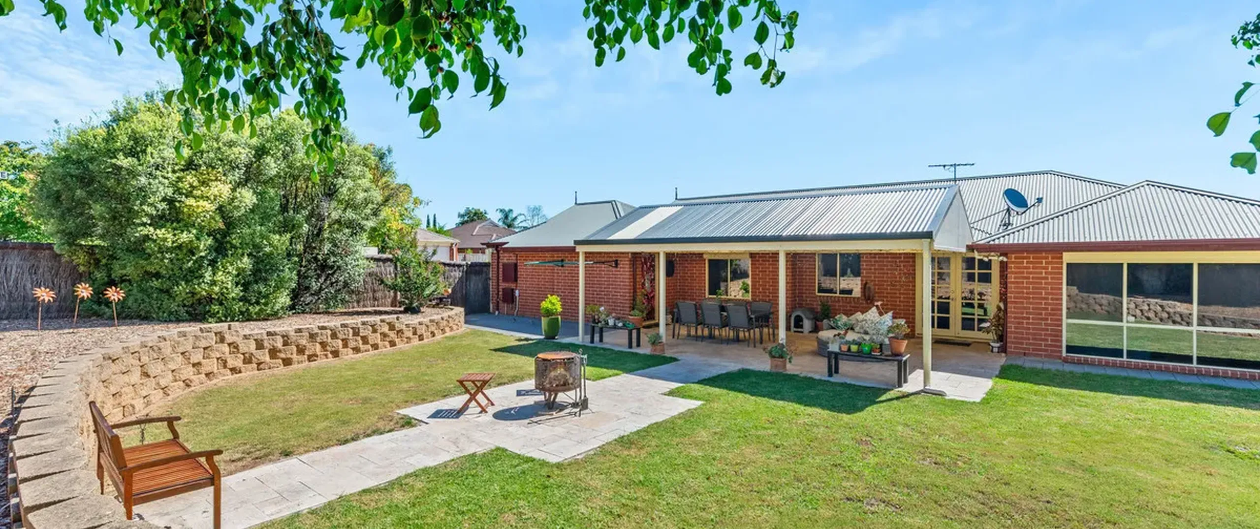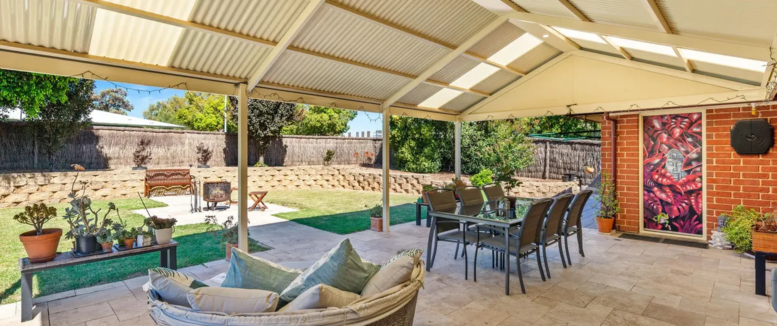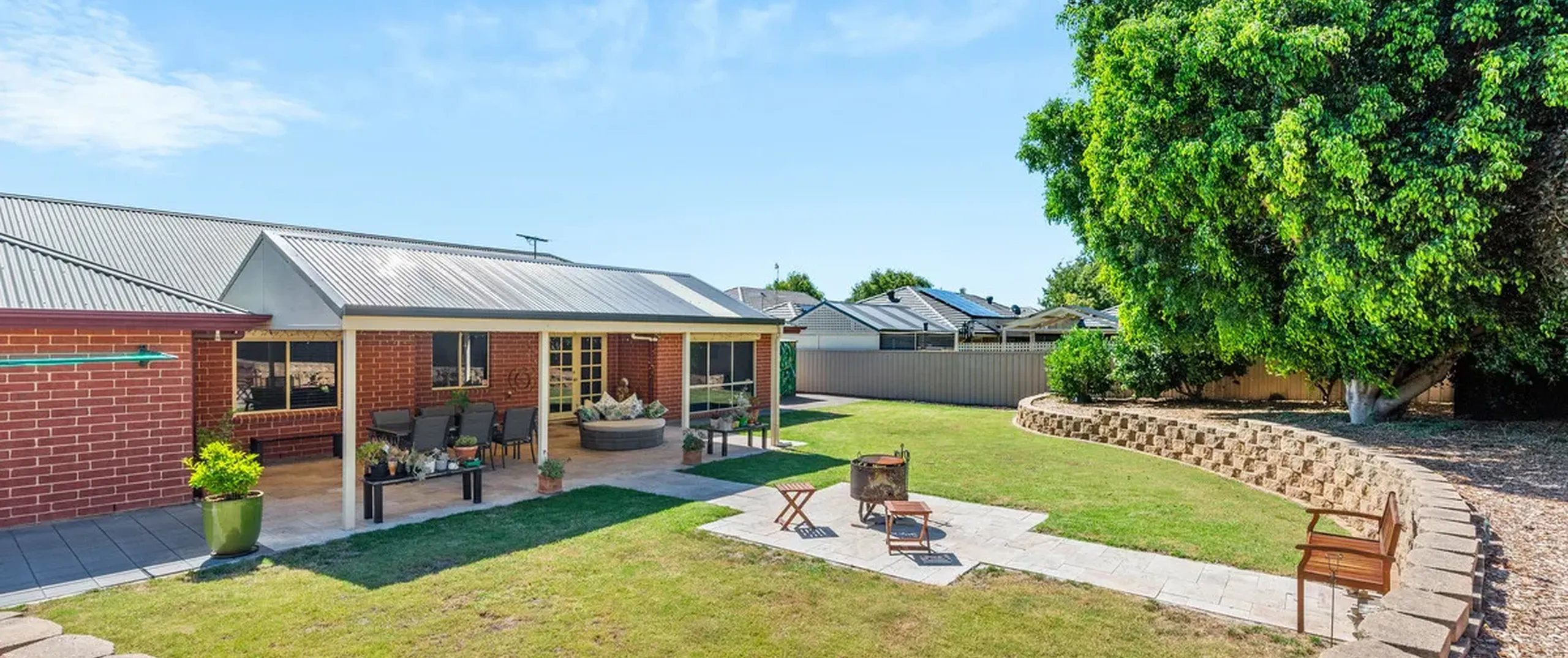 - Expansive outdoor area with pitched roof pergola overlooking the lush grass where the kids and pets can run free
