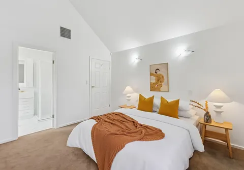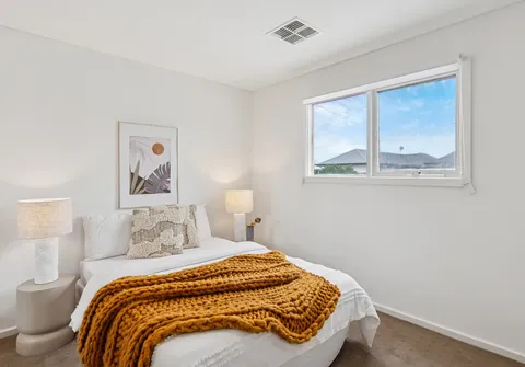 At the heart of the home lies a Caesarstone-topped kitchen designed for both beauty and function. Upstairs, light continues to pour in, enhancing a serene master bedroom with vaulted ceilings and generous ensuite with bath. Bedroom 2 features a walk-in robe, while Bedroom 3 includes a built-in robe and enjoys direct access to the main bathroom.