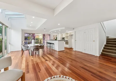Step through secure gates to a home that immediately feels warm and inviting. Natural light flows across timber floors, from the elegant living area to the open-plan dining and family space framed by large conservatory windows overlooking the leafy courtyard.