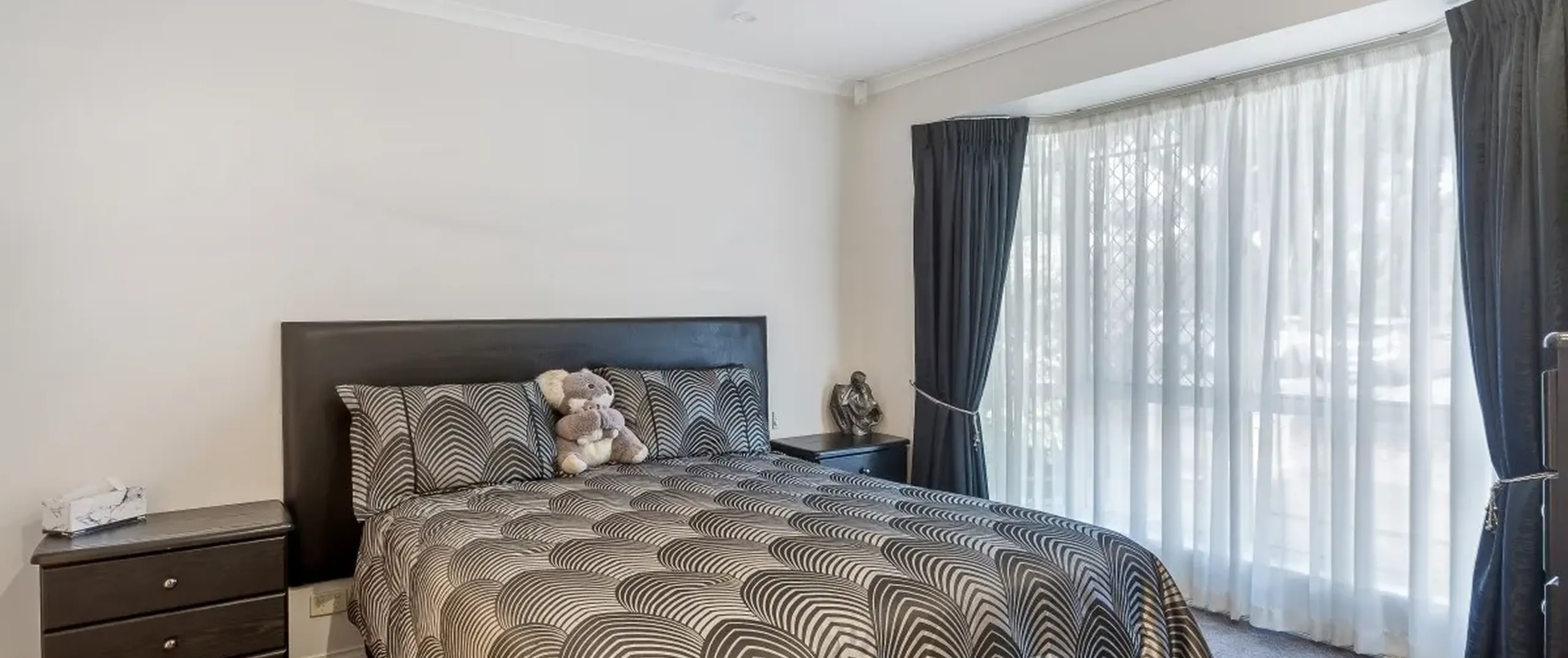 - Master bedroom with walk in robe, ceiling fan, direct access to the two-way bathroom and bay window with lake views