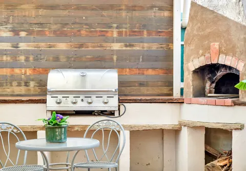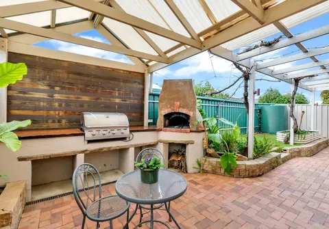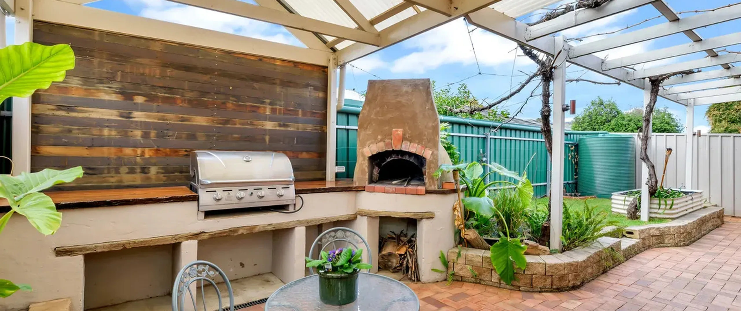 - Artisans entertaining area situated under a pitched pergola, featuring an inbuilt pizza oven and BBQ